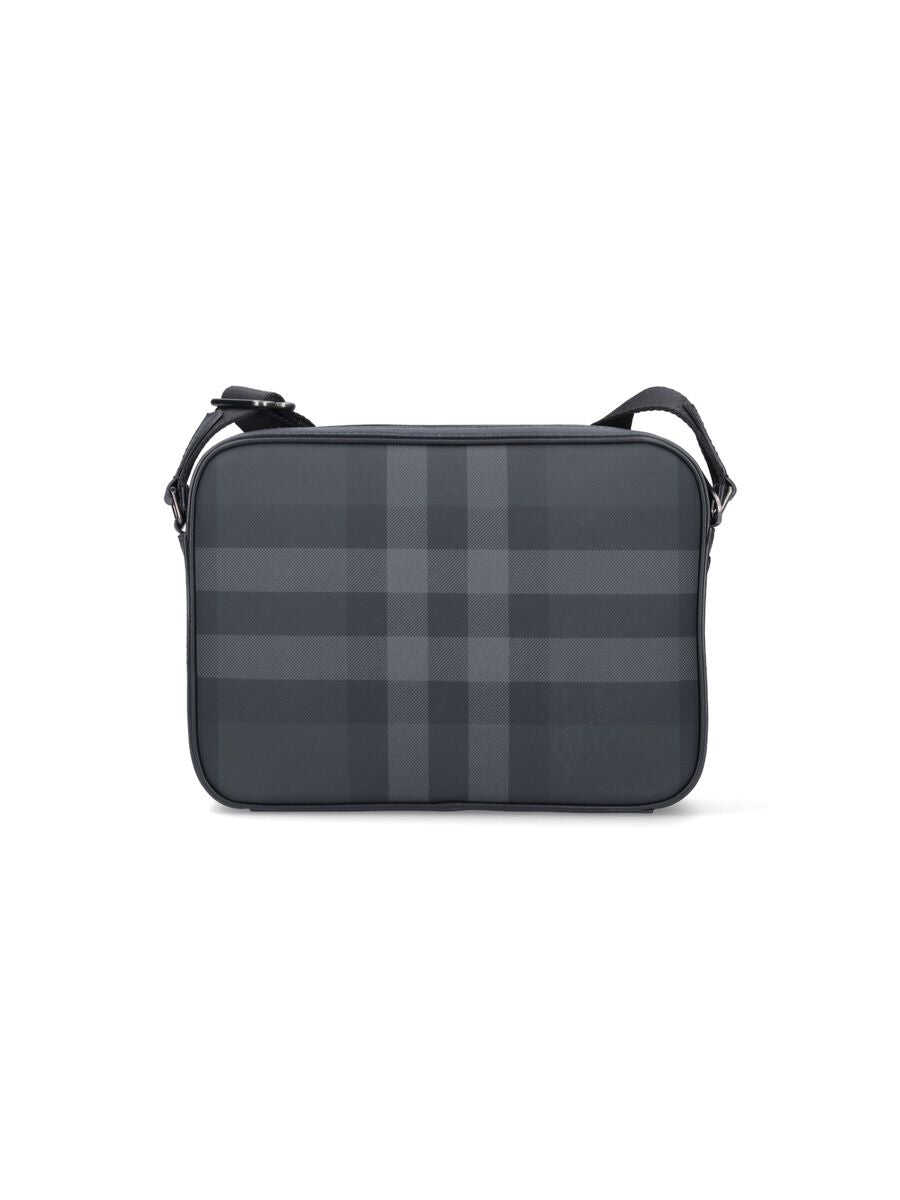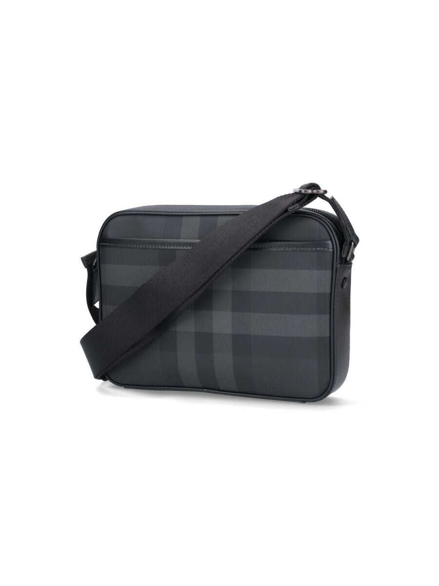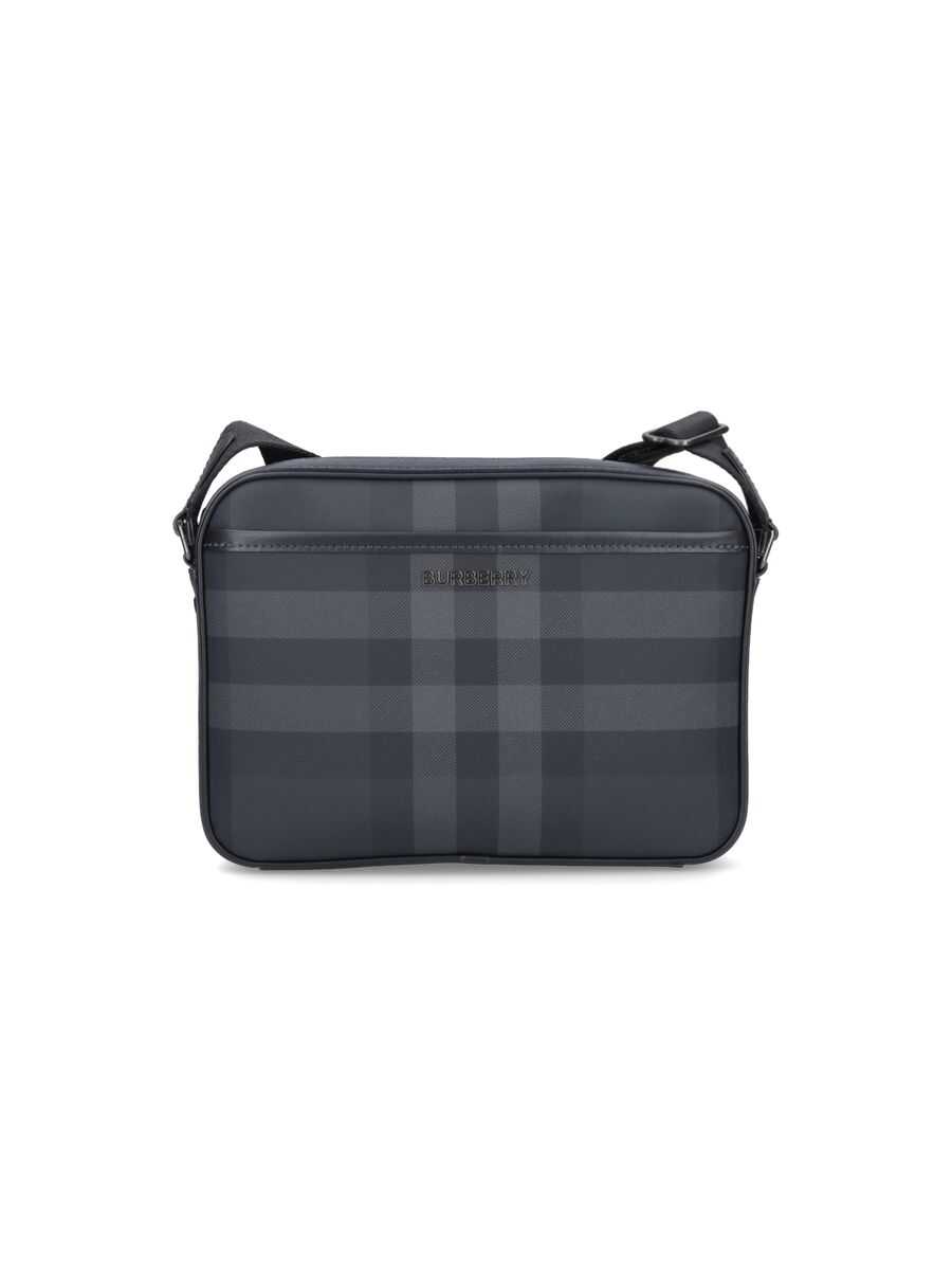 Black shoulder bag. Adjustable shoulder strap. Front pocket with magnetic button. Interior compartment. Applied logo on front. Check pattern. Zipper closure. Width: 25.5 Height: 19 Depth: 5.5