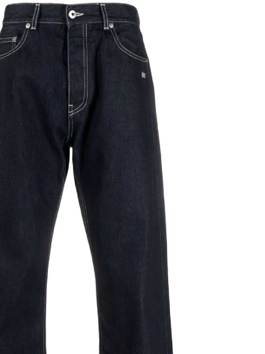 logo-embroidered skate jeans from OFF-WHITE featuring embroidered logo to the front, contrast stitching, mid-rise, belt loops, front button and zip fastening, classic five pockets, indigo blue, cotton and straight leg. FRONT RISE: 31.8 Centimetres INSIDE LEG: 86.4 Centimetres BACK RISE: 34.3 Centimetres HIPS: 101.6 Centimetres Hem Width: 45.7 Centimetres WAIST: 88.9 Centimetres