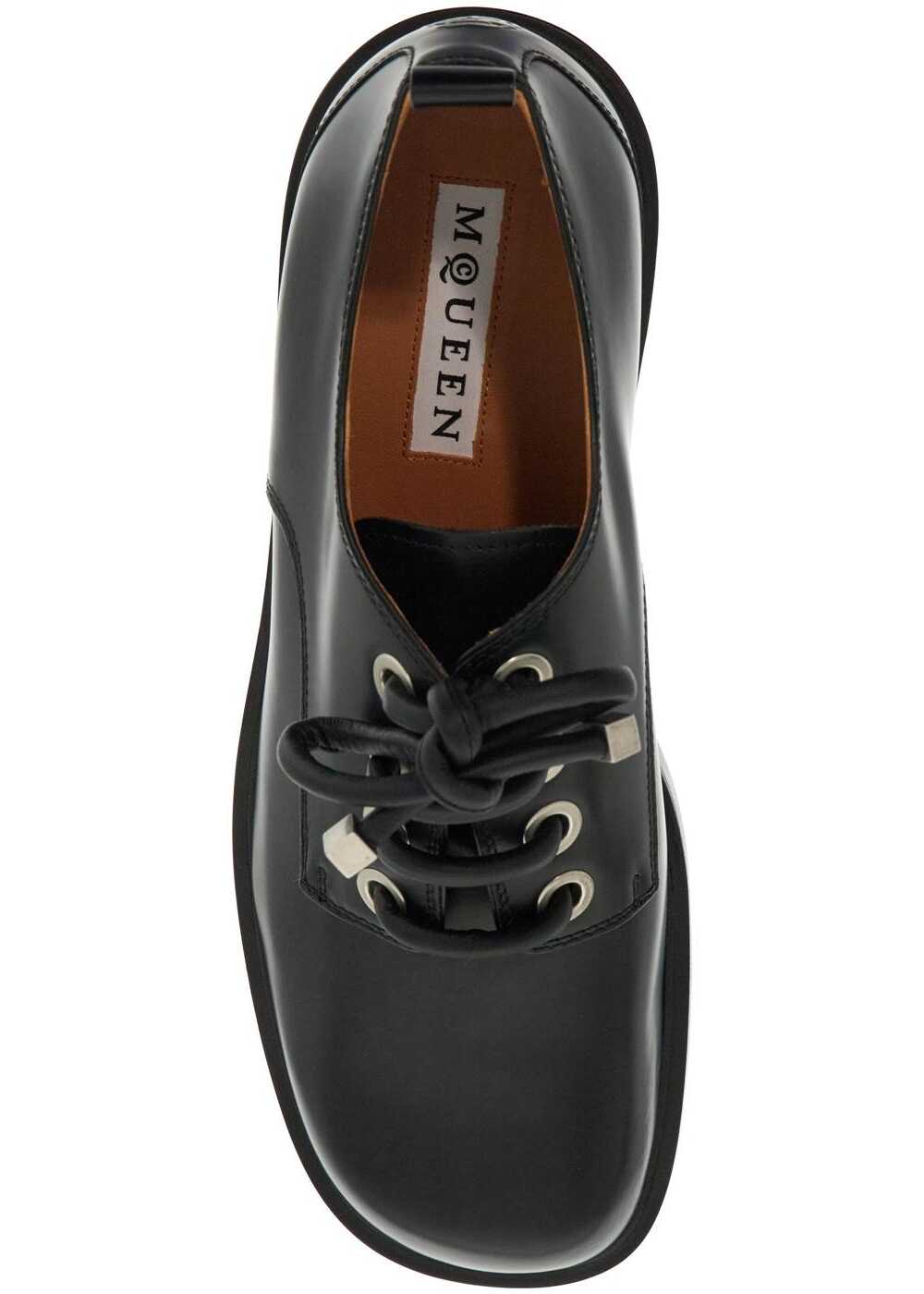 These Alexander McQueen lace-up shoes are made of smooth leather and feature a voluminous design with tubular leather laces and silver metal tips. They are adorned with an embossed skull on the back. The interior is lined with leather and the sole has a rubber inlay for added comfort.