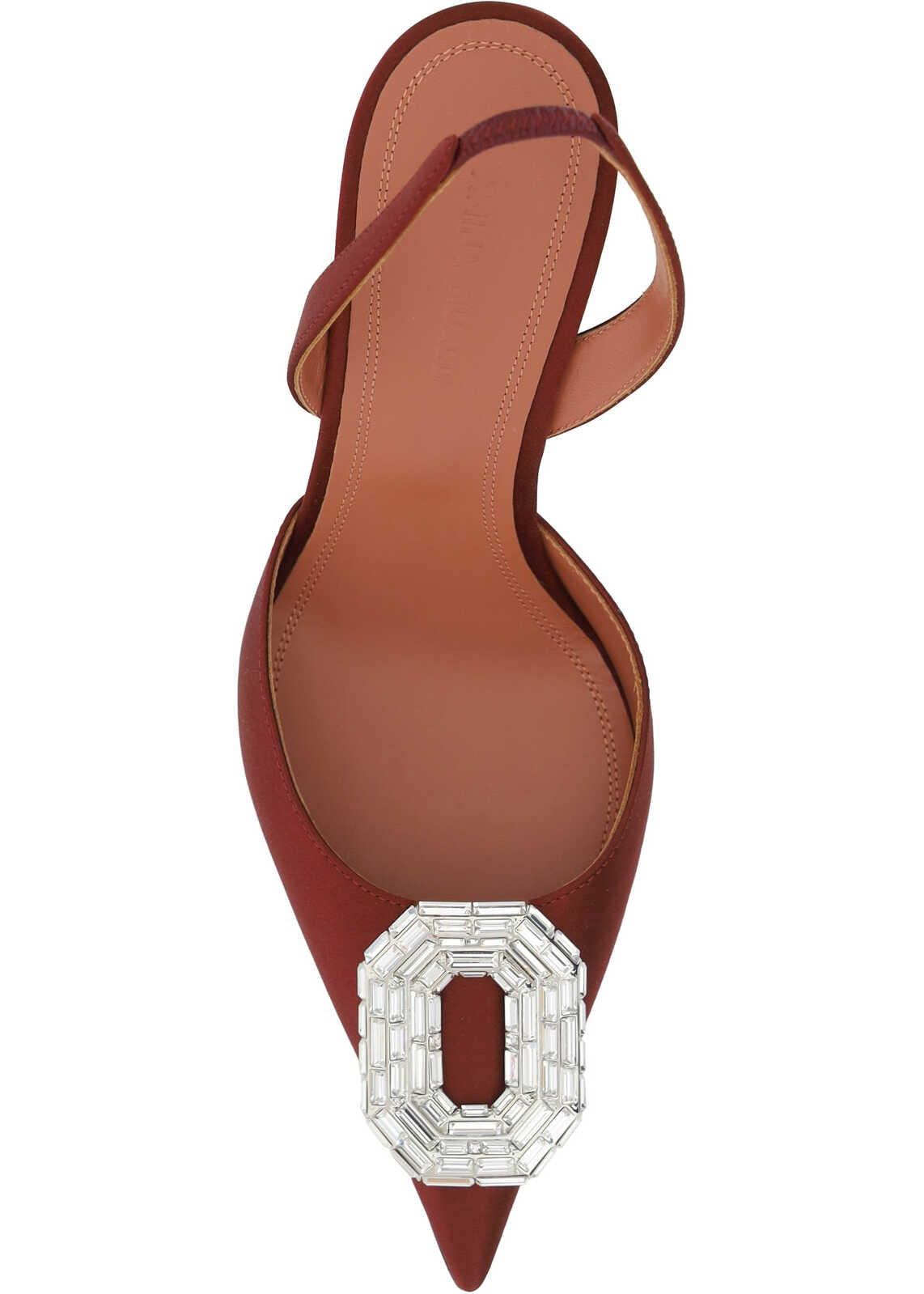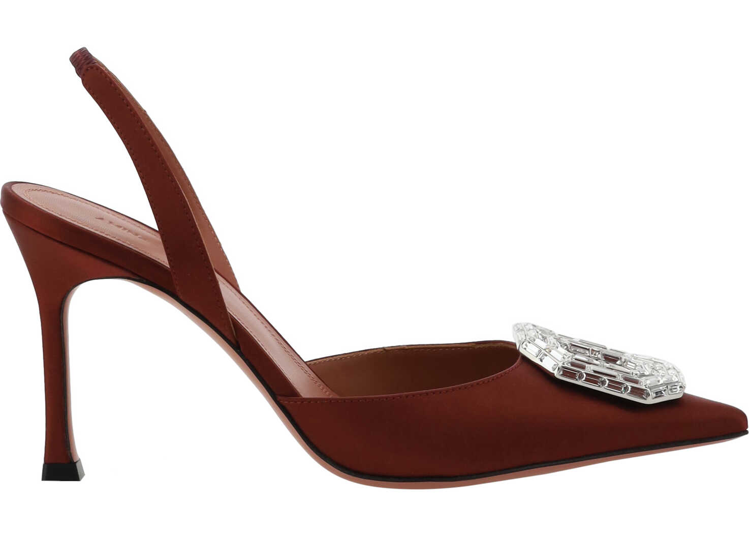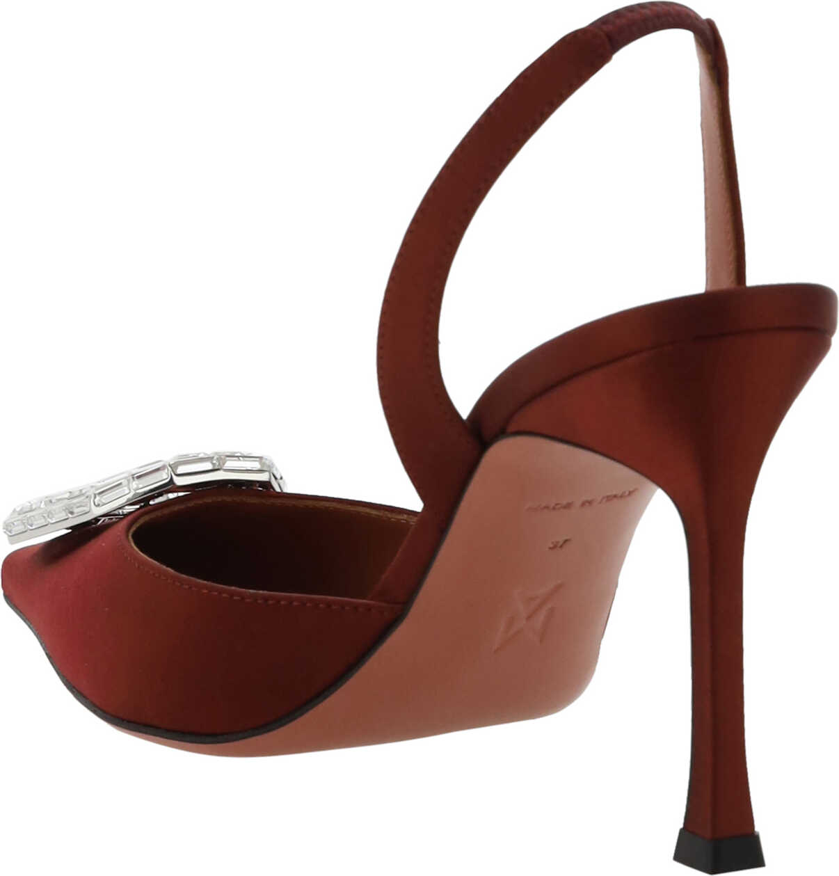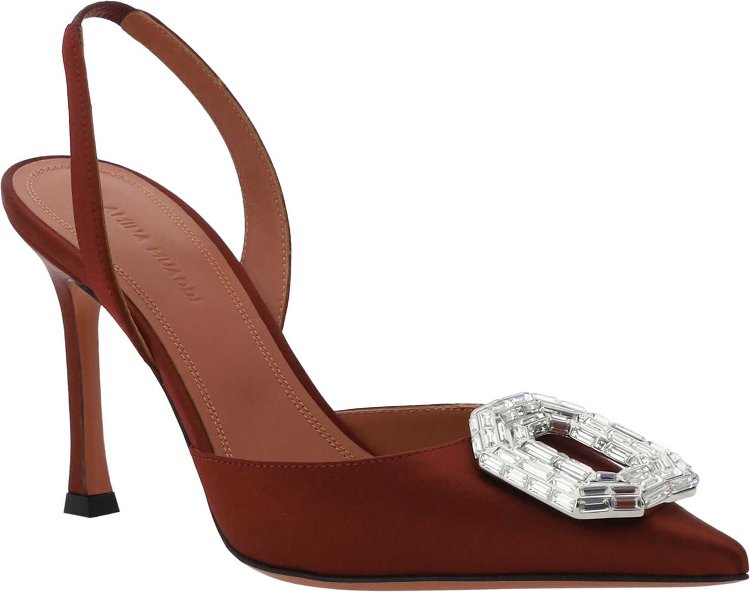 Camelia Pumps by Amina Muaddi, almond toe on front, leather stiletto heel, rhinestone and glitter jewel appliqué embossed on toe, slingback detail on heel, press-on logo leather insole.