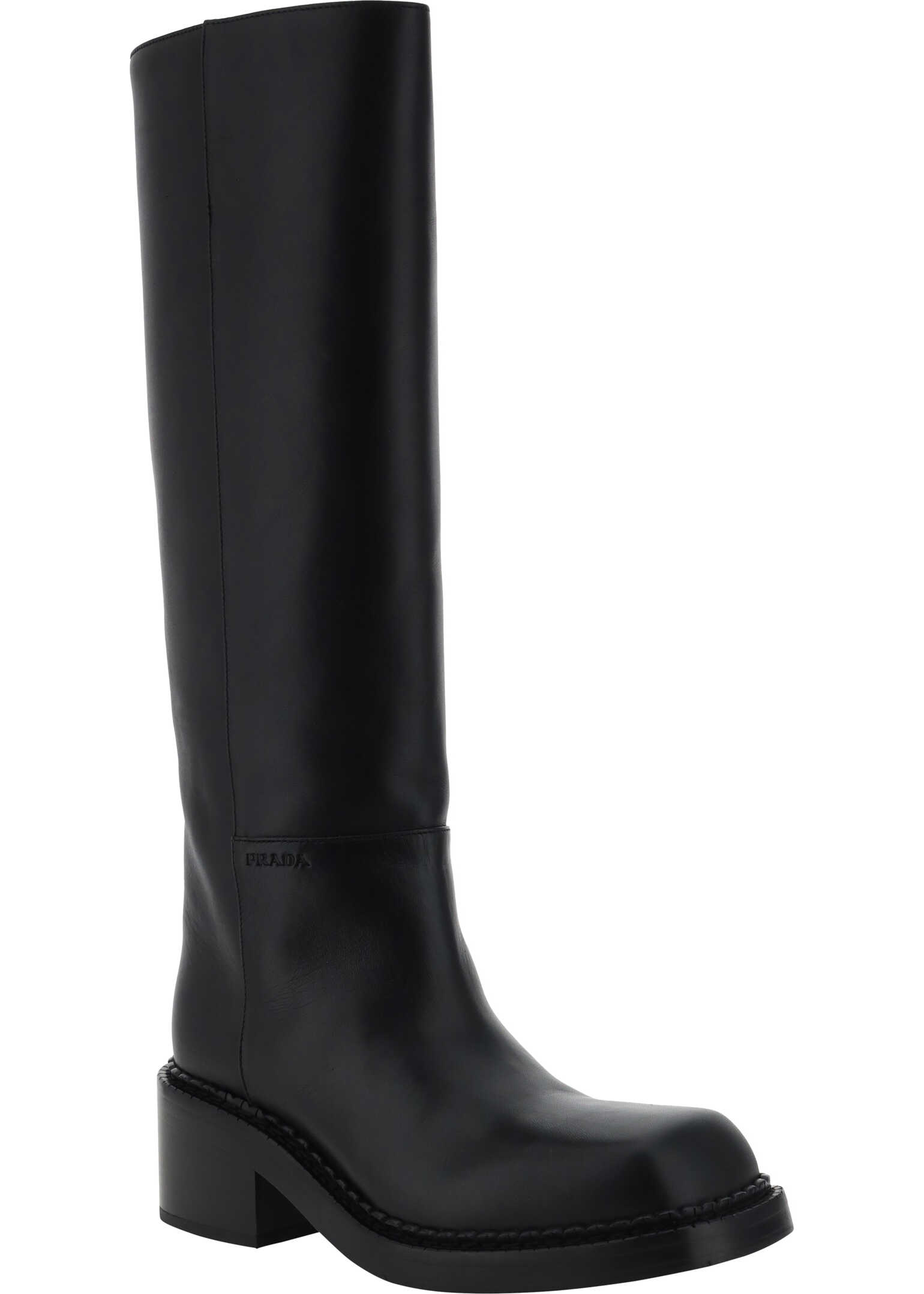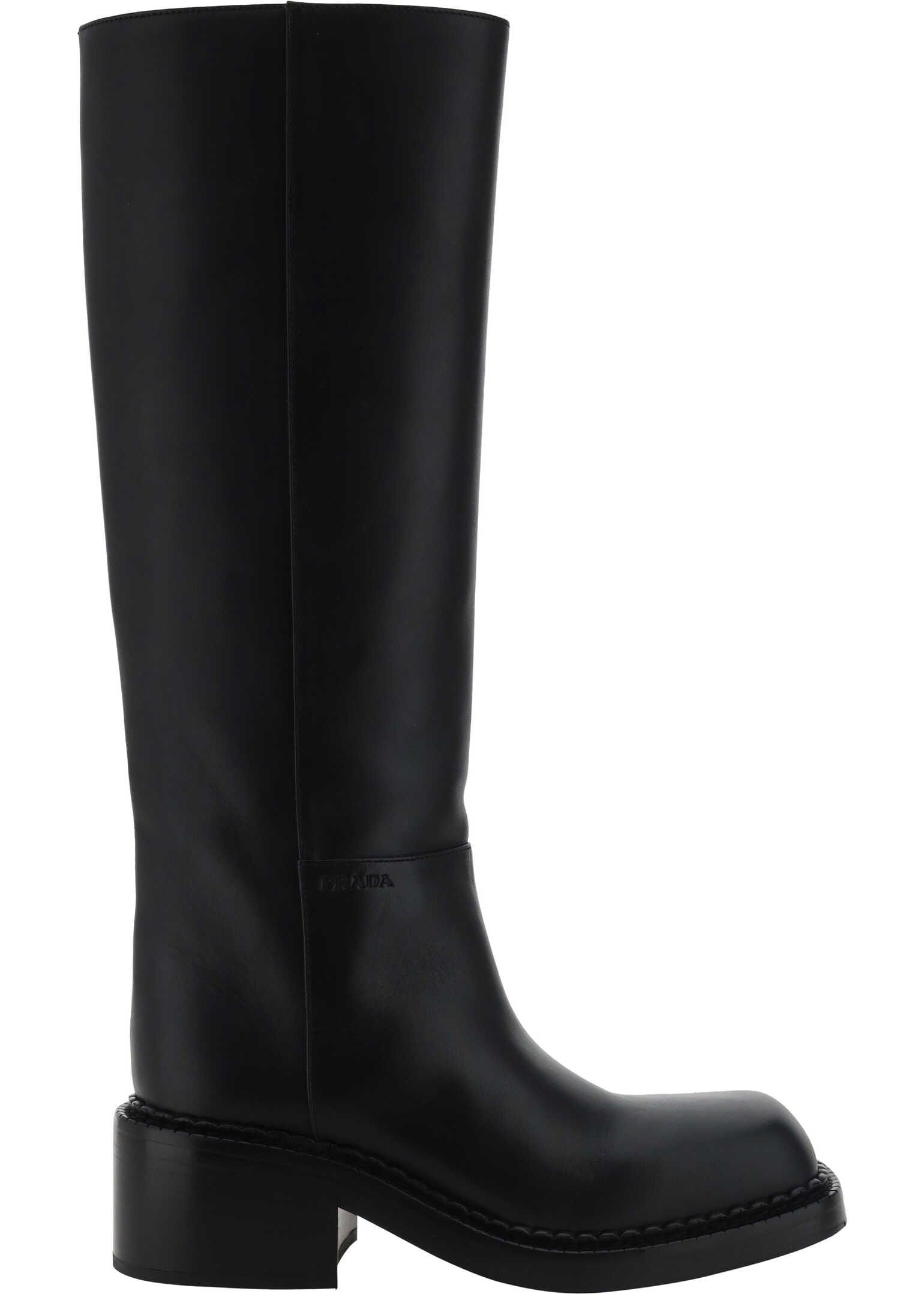 Leather Boots by Prada, knee-high model, leather block heel, almond toe, slip-on style, iconic brand monogram press-stamped on side panel.