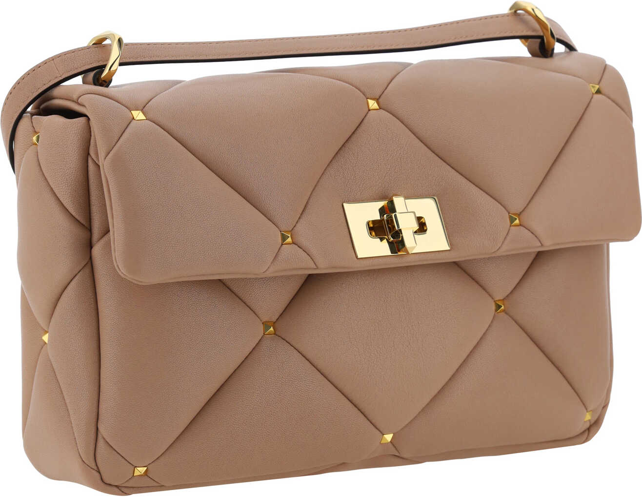 Calfskin Roman Shoulder Bag by Valentino Garavani featuring a flat shoulder strap with chain detail, a front swivel and flap closure, a single interior compartment, and an all-over quilted design.