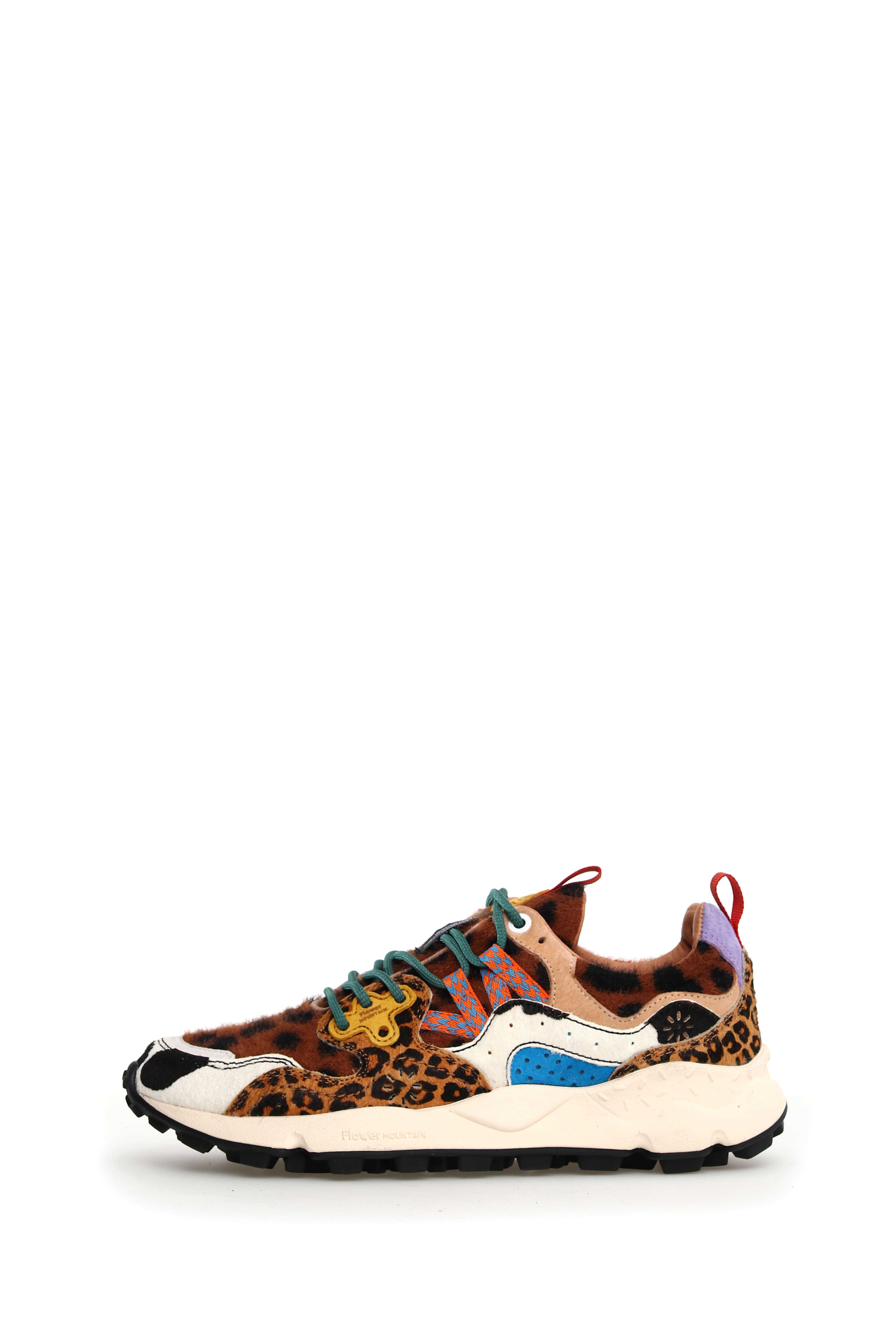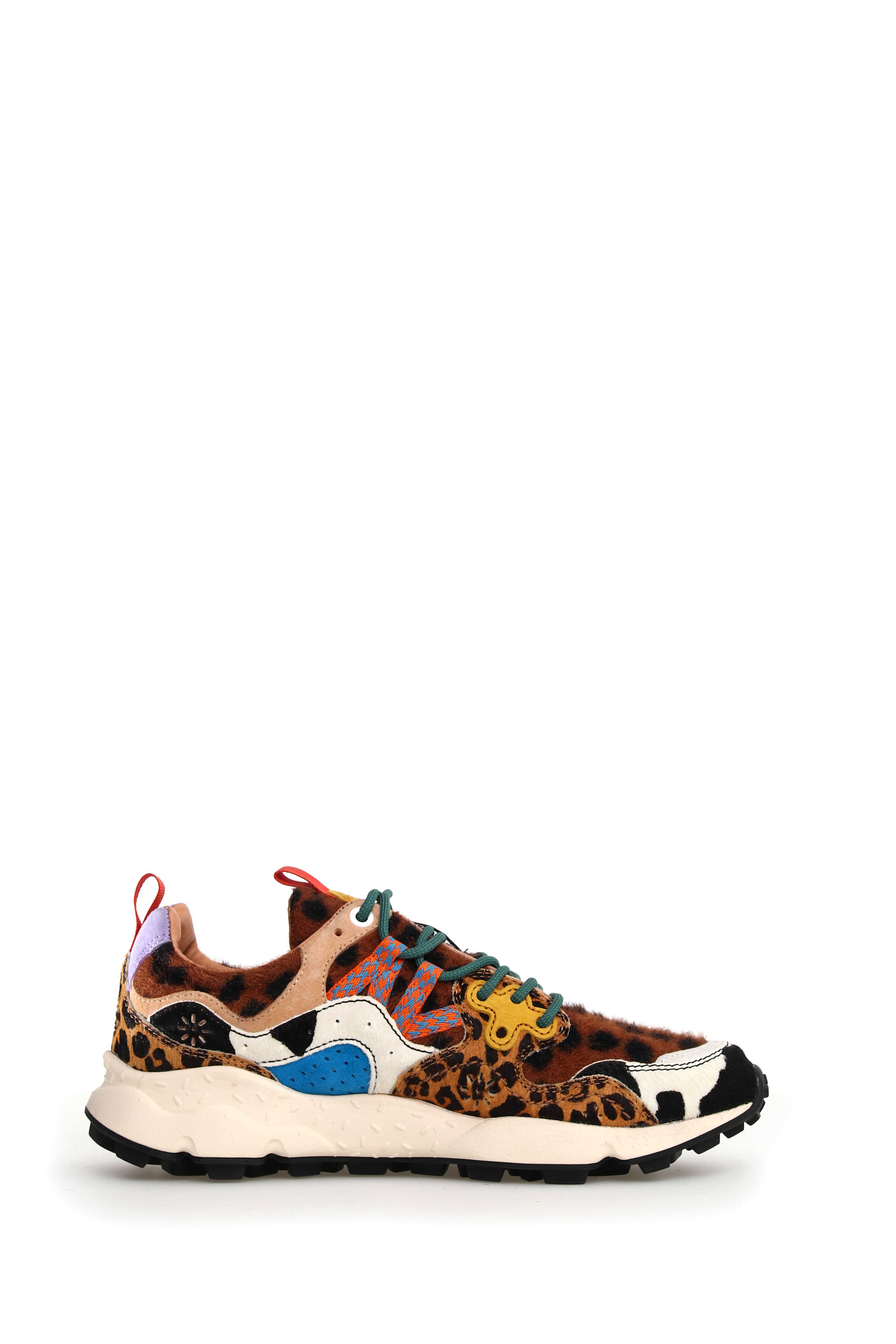 Flower Mountain sneakers in pony skin with various animal prints and suede details. Perforations and reinforced eyelets. Removable natural cork insole, rubber sole with a serrated tread.