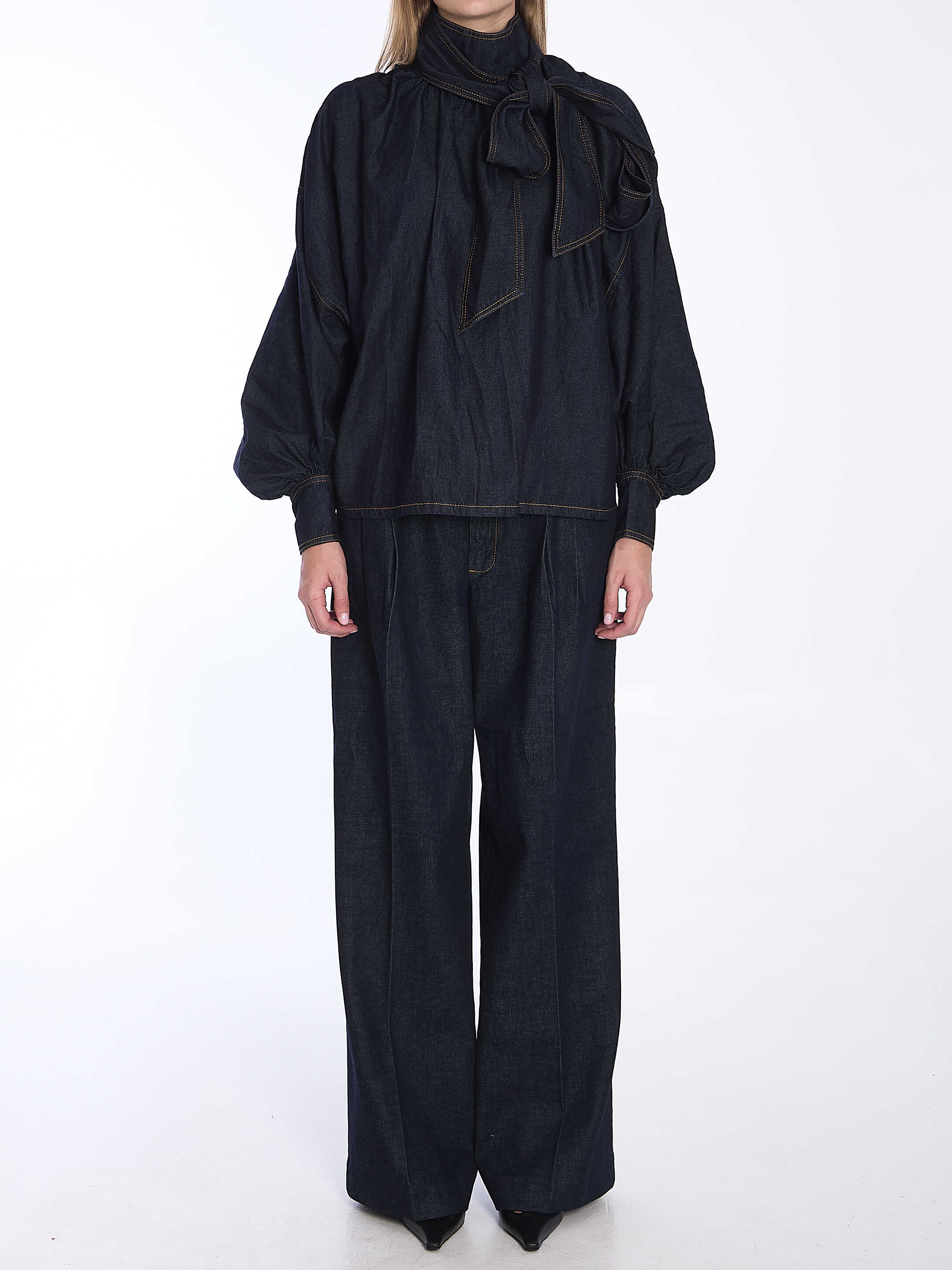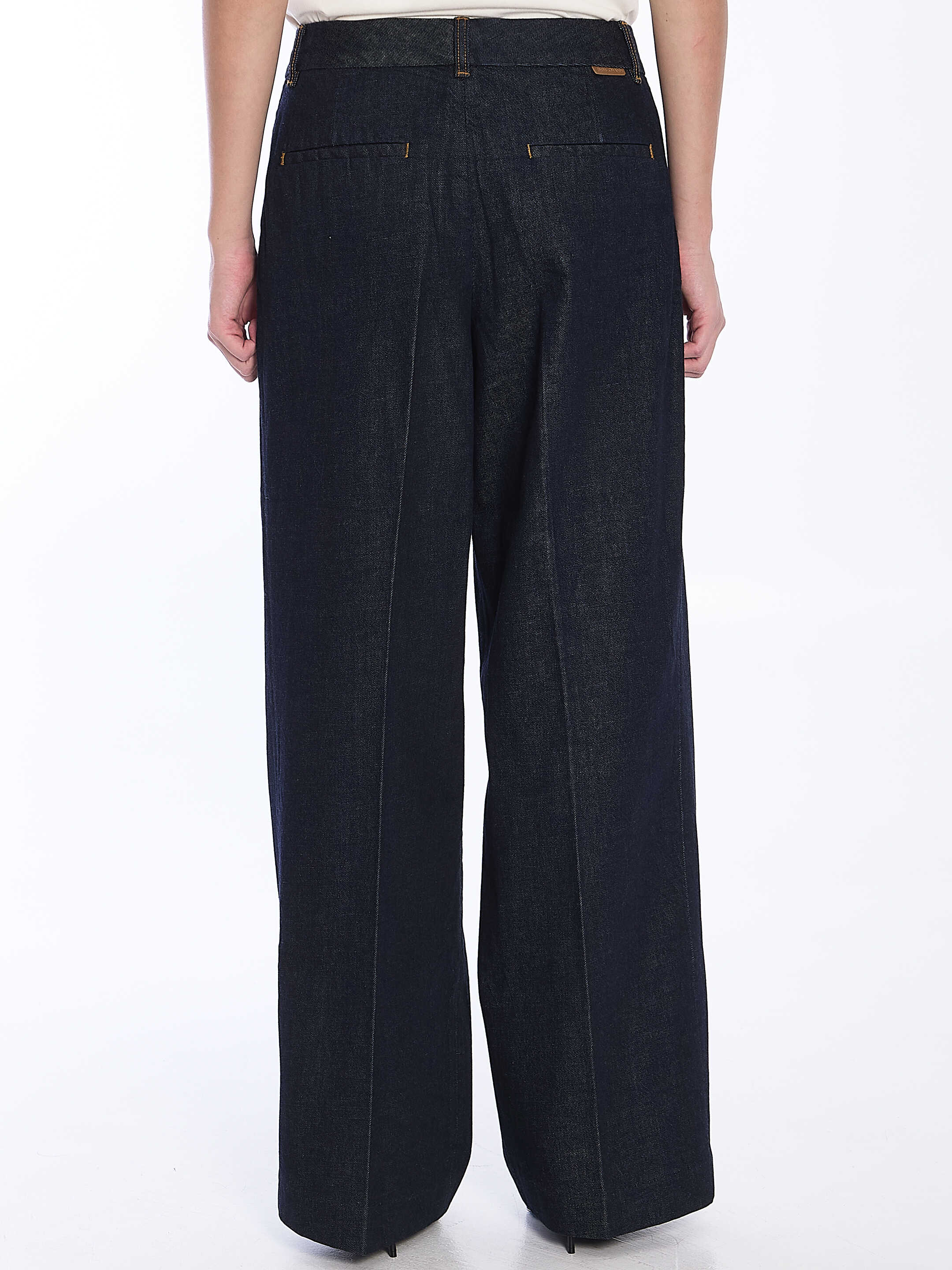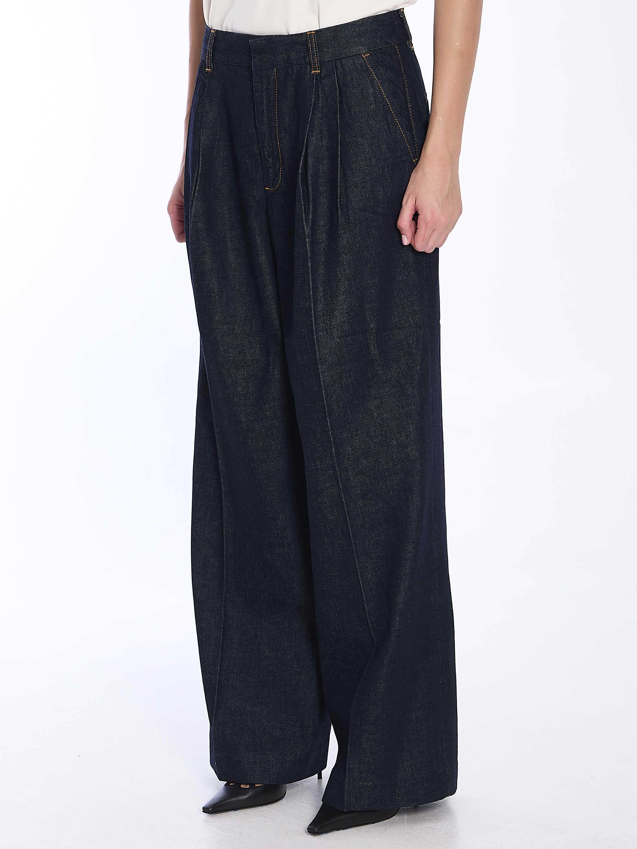 Wide straight leg Illustration jeans in Night Sky cotton blend denim with pleats. It features zip, button and hook closure, two side welt pockets, two rear welt pockets and belt loops. Regular fit.
