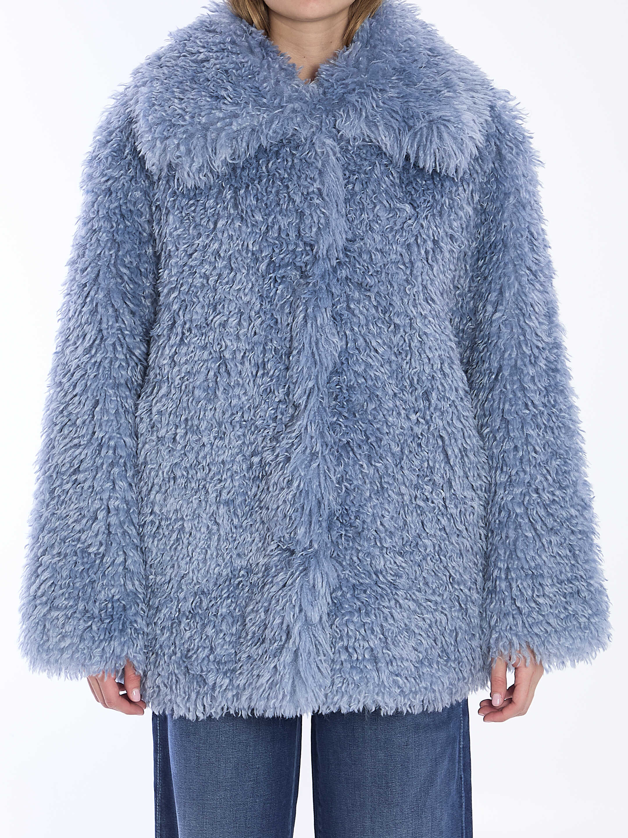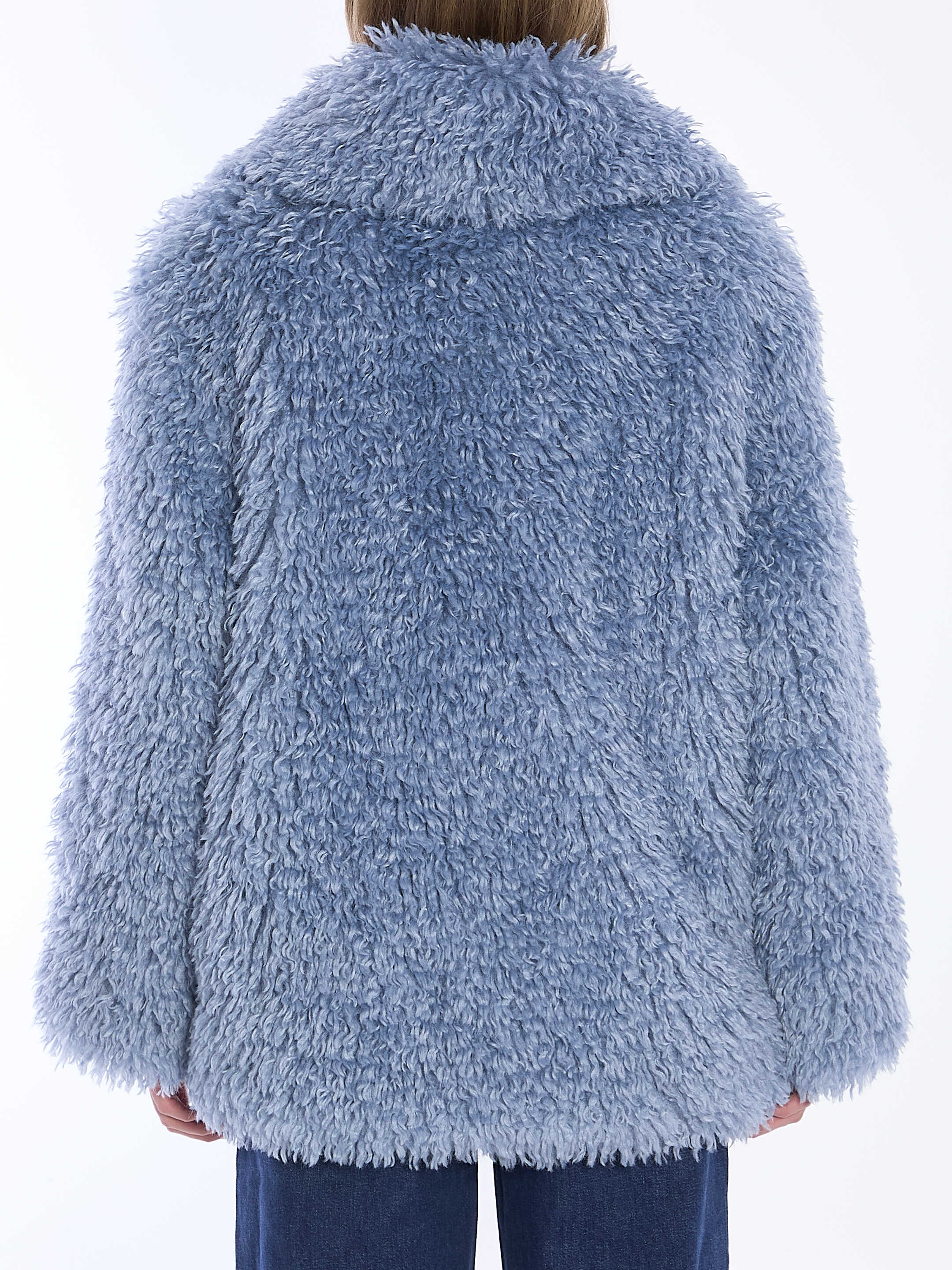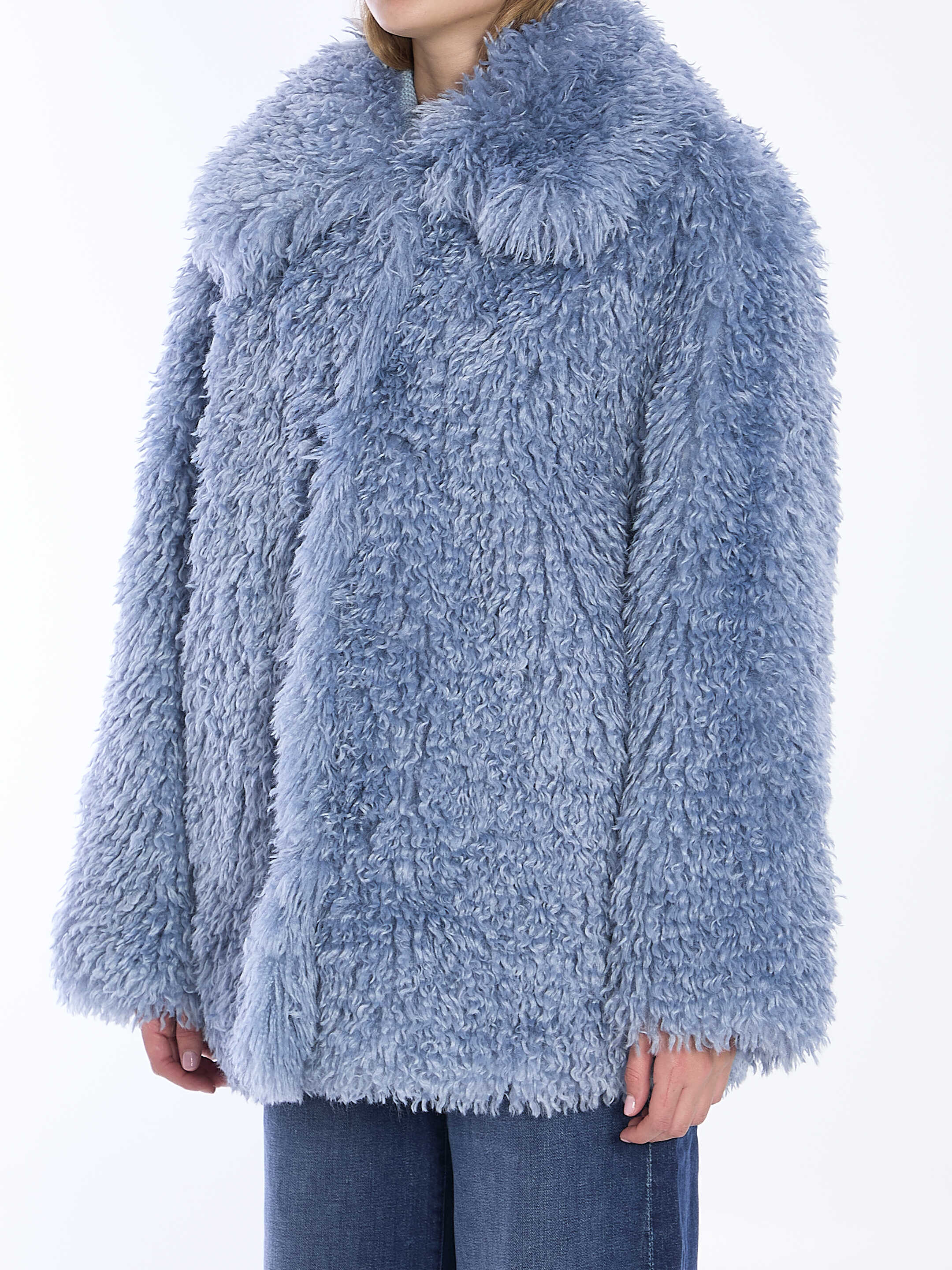 Antonia shaggy coat in light-blue faux fur. It features front press-stud closure and two side welt pockets. Lined. Loose fit.