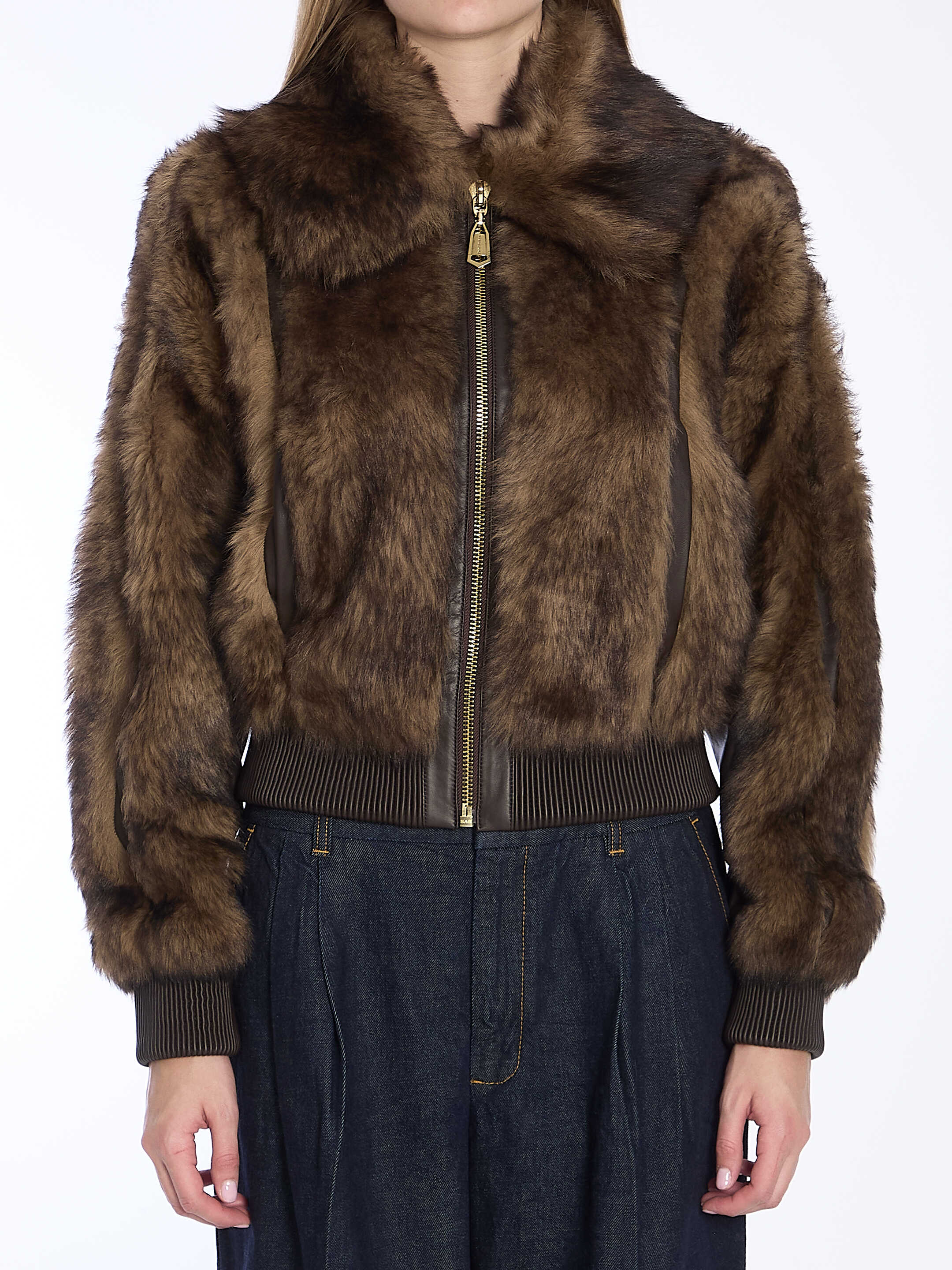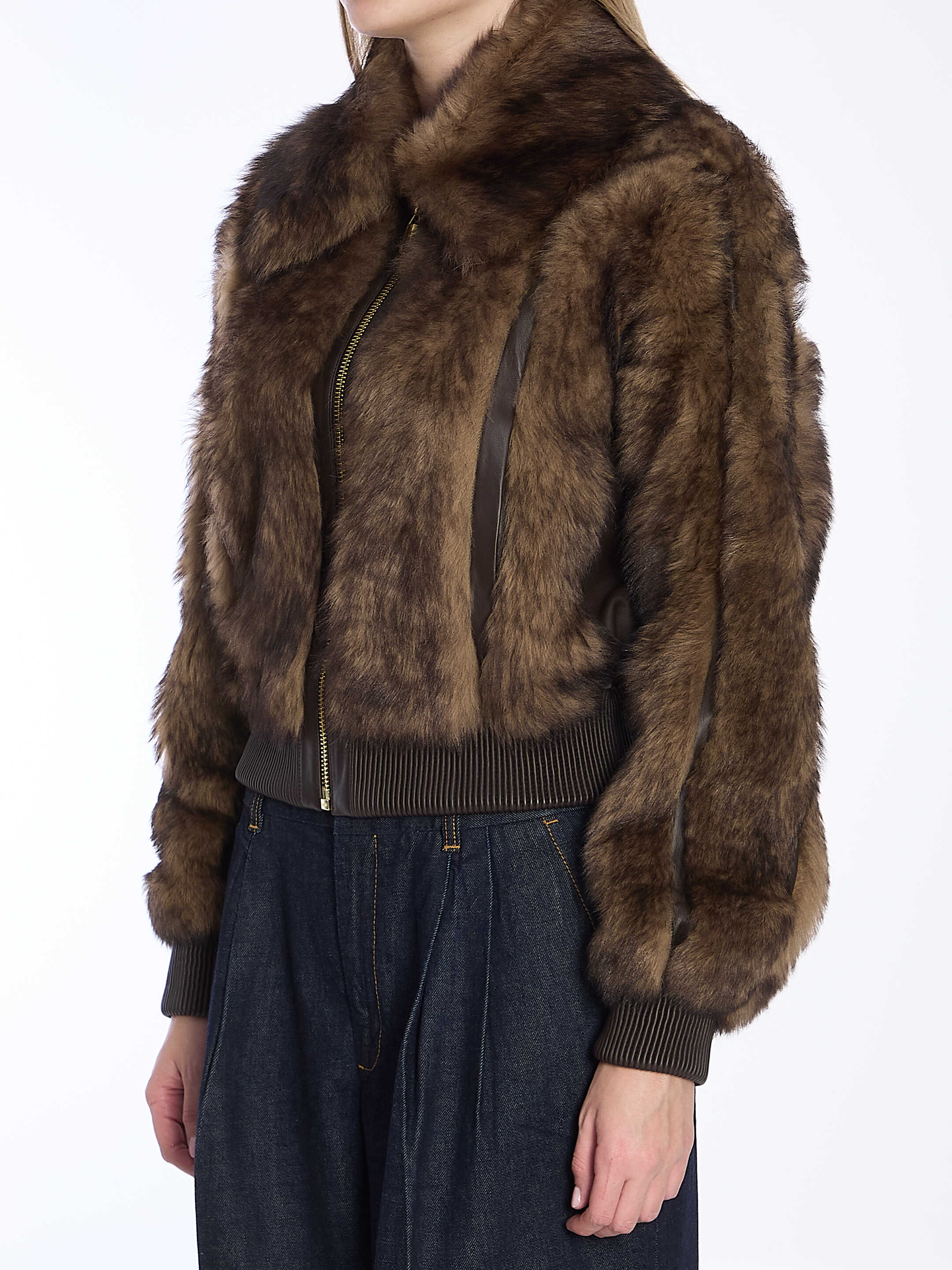 Illustration shearling jacket in Chocolate crafted from shearling with leather inserts. It features front zip closure, two side welt pockets, elasticated ribbed cuffs and elasticated ribbed hem. Regular fit.