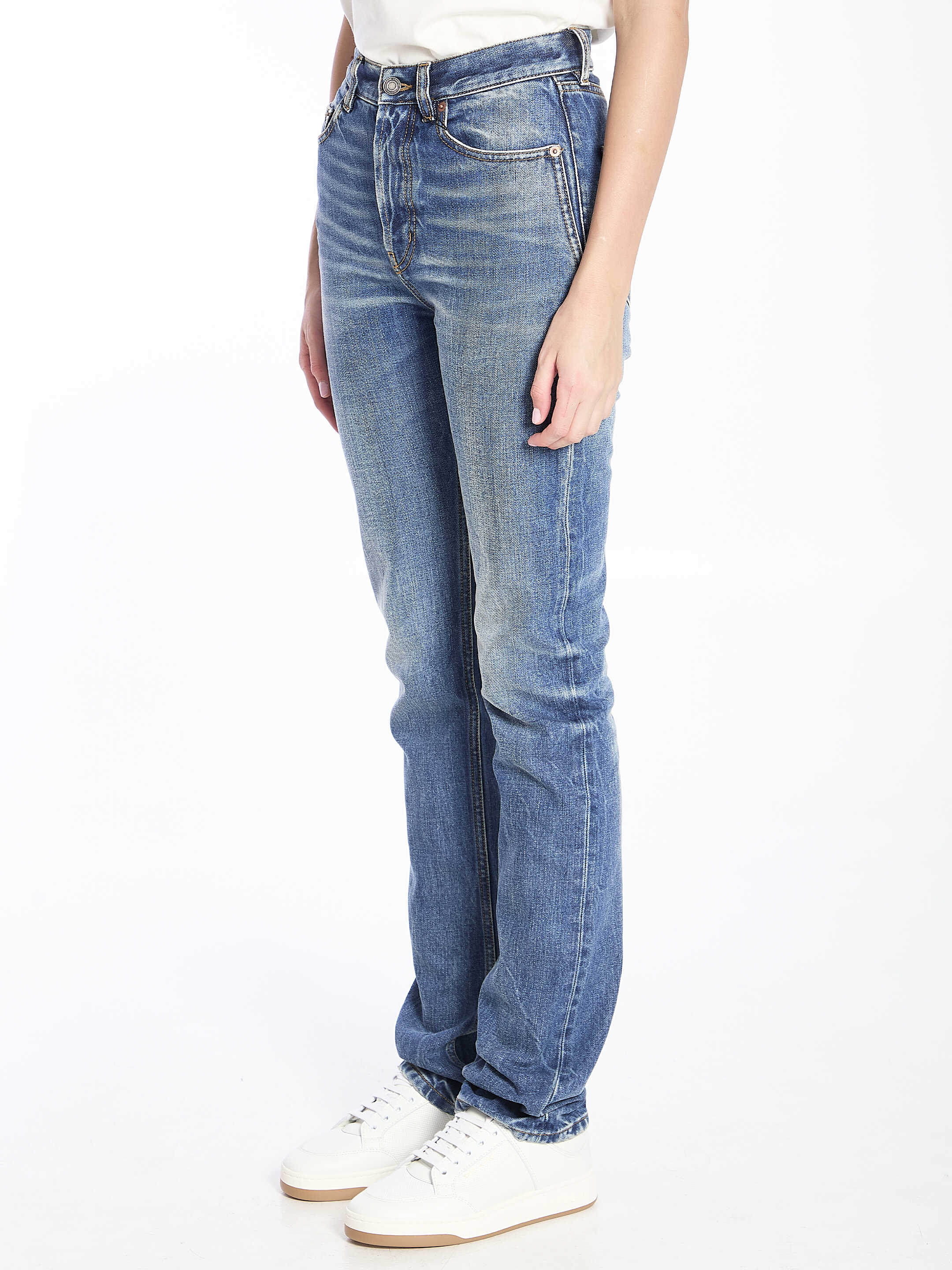 90s style high-waisted straight long leg jeans in 50s blue denim. It features button closure, five-pocket design, belt loops and rear patch. Slim fit.