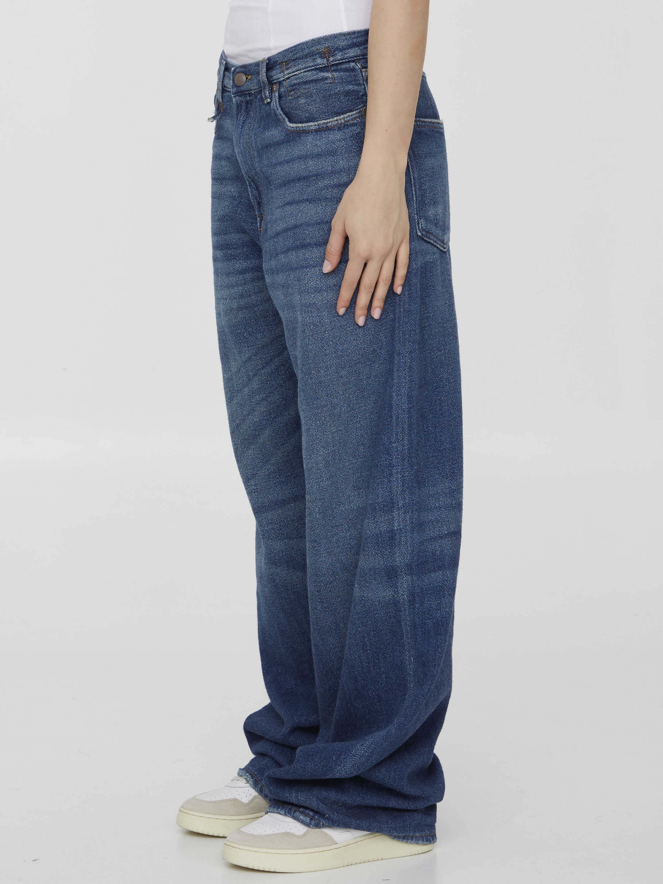 Wide-leg washed-out blue denim jeans. Zip and button closure, five-pocket design, belt loops and rear leather patch.