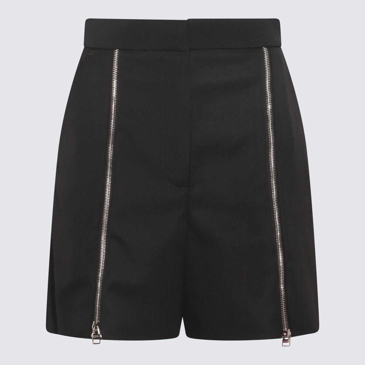Black wool zipped shorts from Alexander McQueen featuring high wiast, concealed zip closure with hook, side pockets, mid length, zipped details at front and silver tone metal finishes.