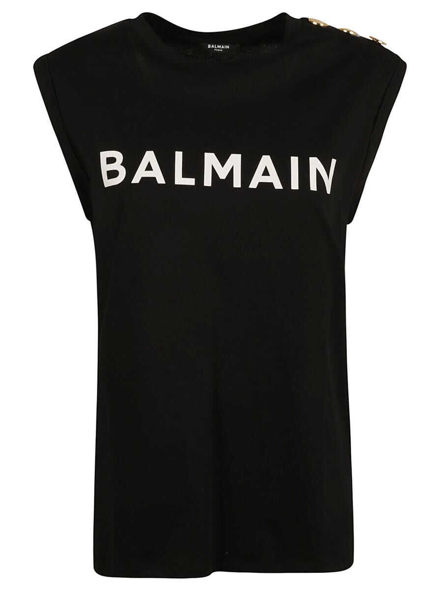Black cotton top from Balmain featuring logo print to the front, round neck, sleeveless, decorative button detailing and straight hem.