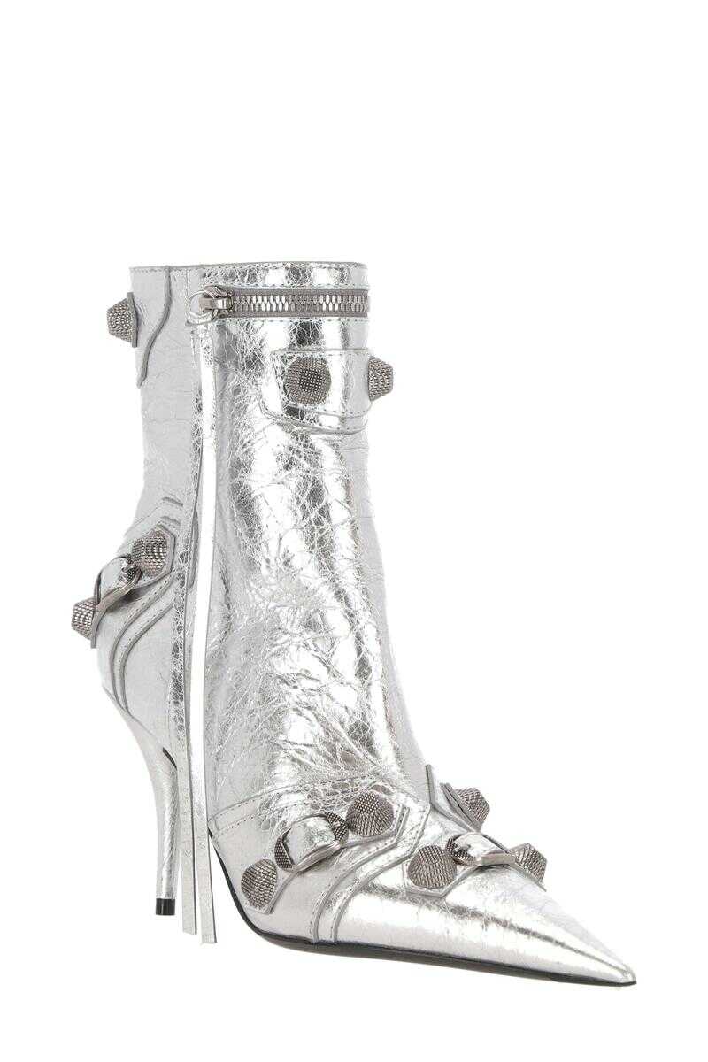 Cagole 90mm metallic ankle boots from BALENCIAGA featuring silver-tone, calf leather, metallic finish, silver-tone stud detailing, zip detail, side zip fastening, ankle-length, pointed toe and high stiletto heel. Conscious: We've partnered with Good On You – an ethical agency that rates how sustainably brands perform. This item comes from a brand that performs well in relation to their impact on the planet..