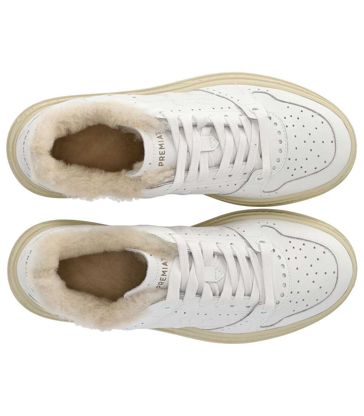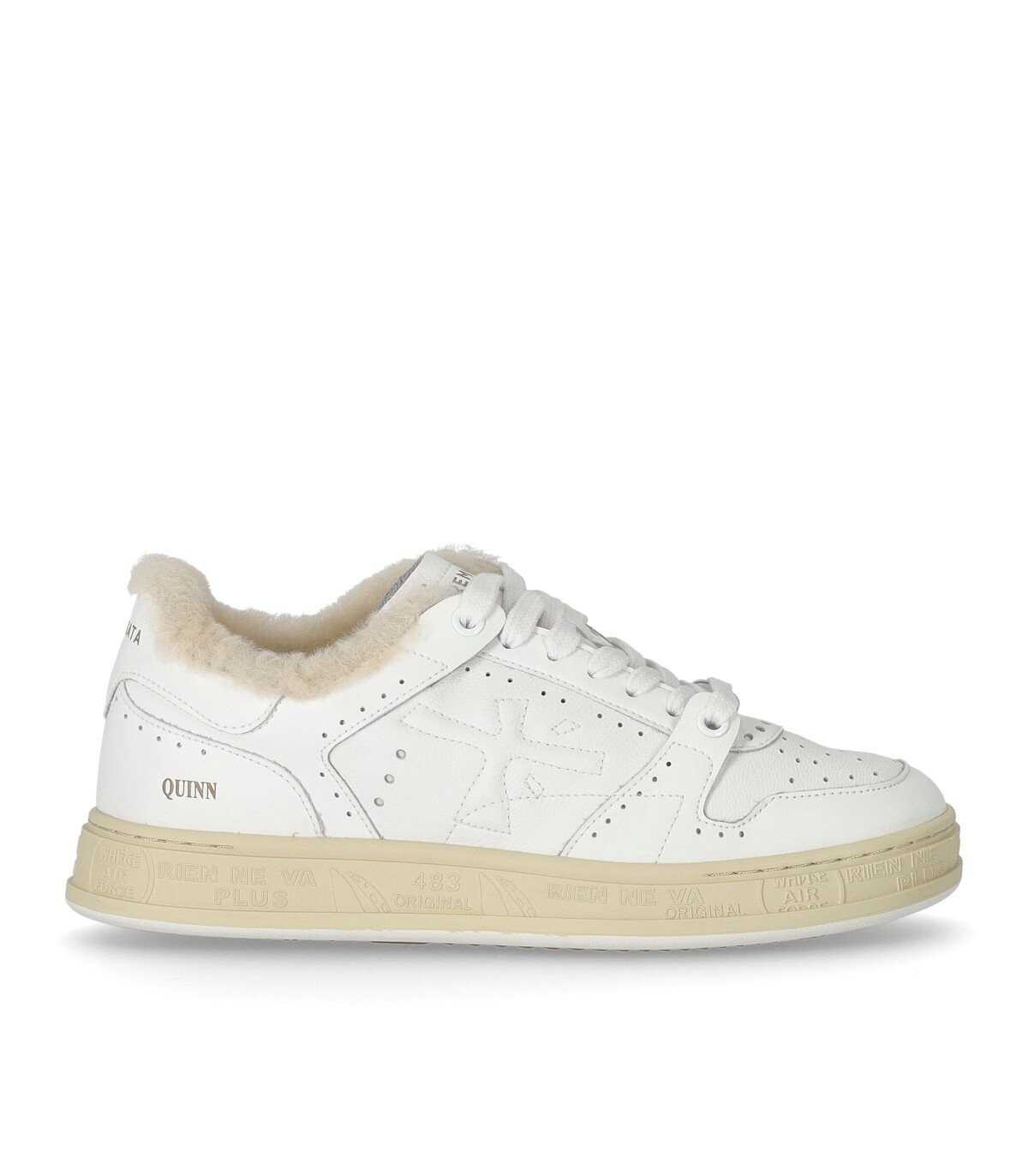 QuinnD 6571M sneaker by Premiata made of soft white leather, featuring perforated details and iconic logo embroidered on the side. Sheepskin lining and white cotton laces. Rubber sole with embossed logo prints, height 3.5 cm.