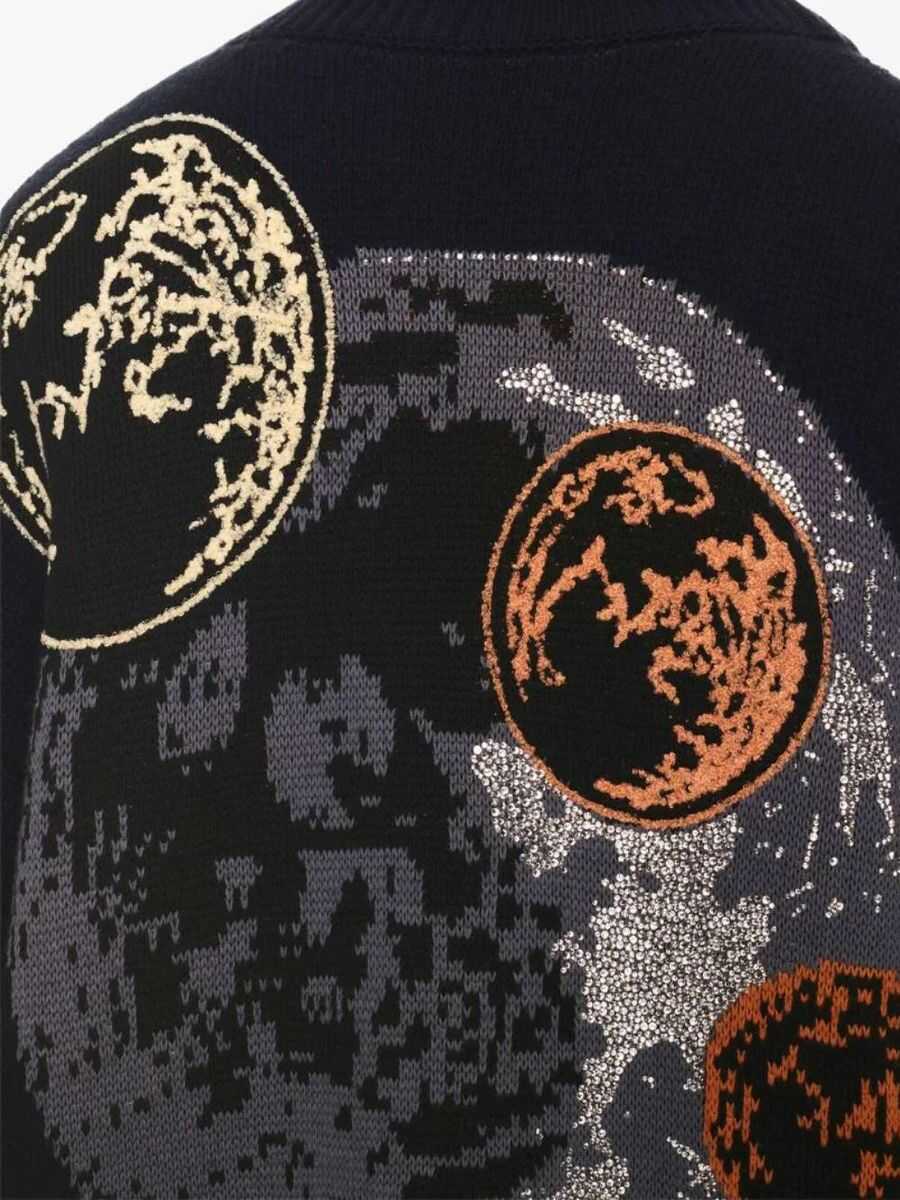 Blue and multicolour wool blend Moon Phase cardigan from Off-White featuring long sleeves, button closure, regular fit, multicolour patches and embroidered logo signature at chest.