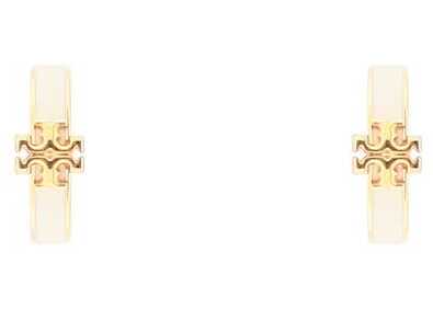 Kira hoop earrings by Tory Burch in enameled gold-finished brass and double T monogram detail. Huggie closure.