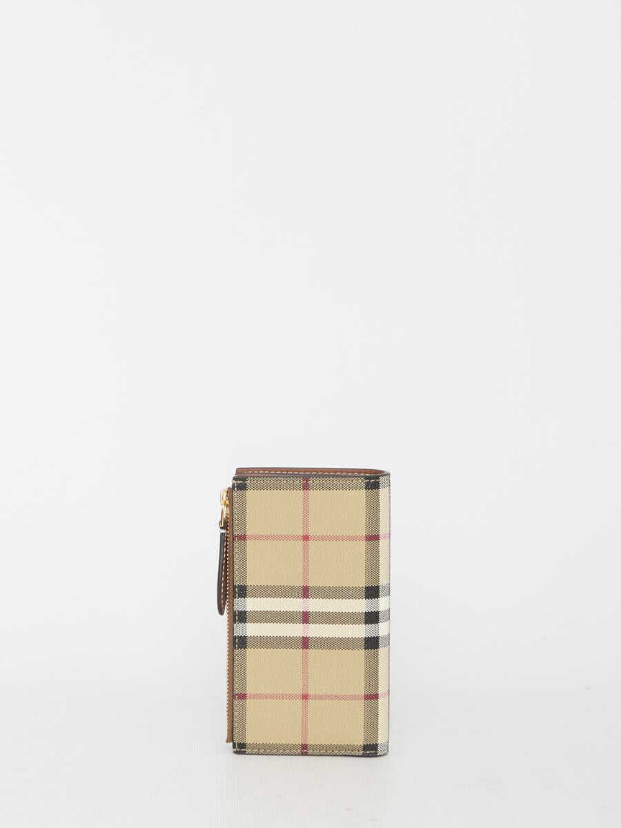 Check Medium Bi-fold wallet in beige Check fabric with leather trims. It features snap-button closure, one zipped coin pocket, one bill compartment, ten card slots and two slip pockets.