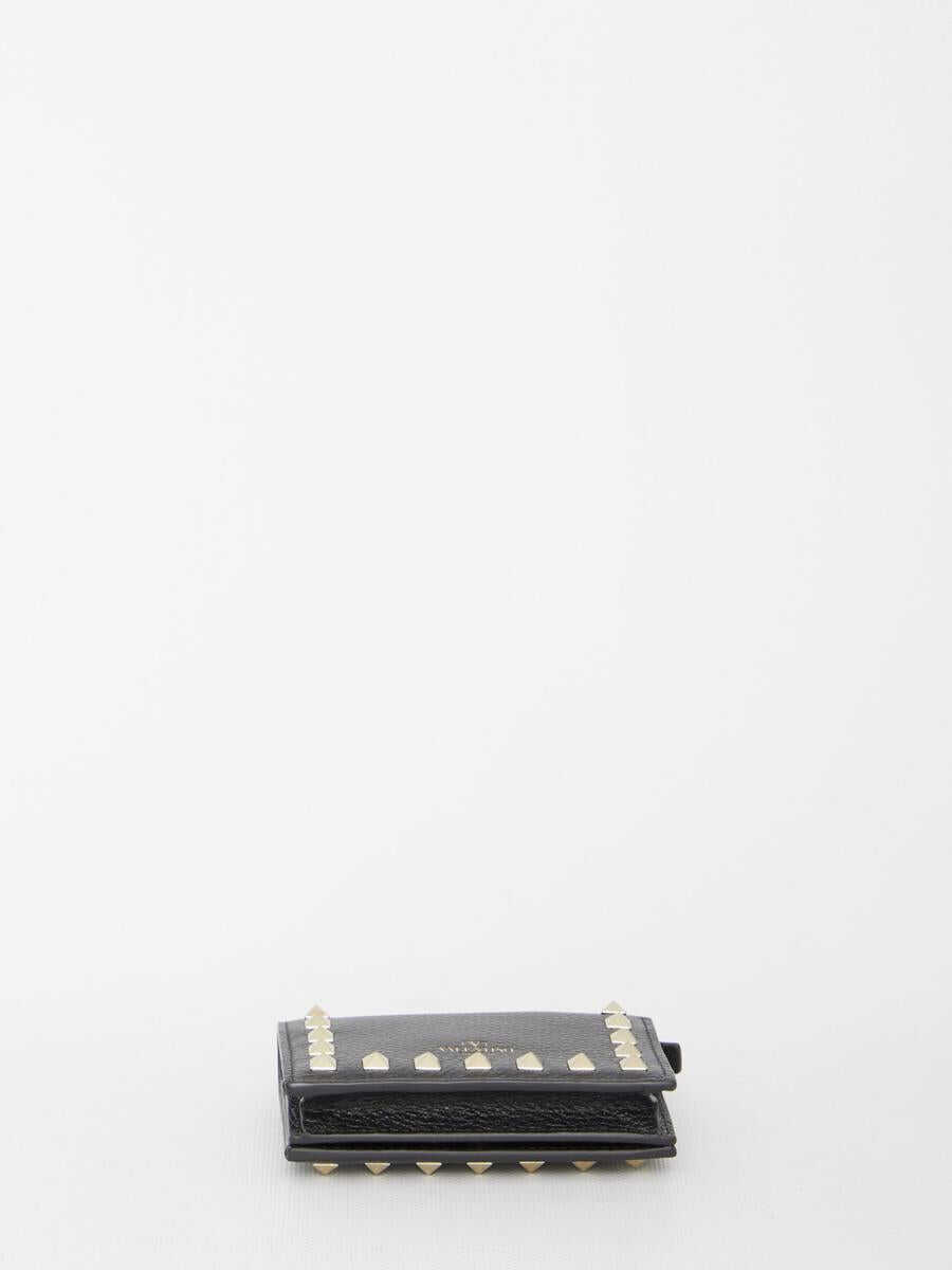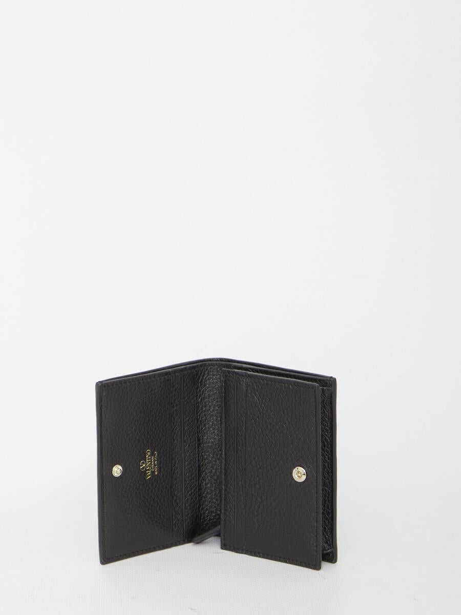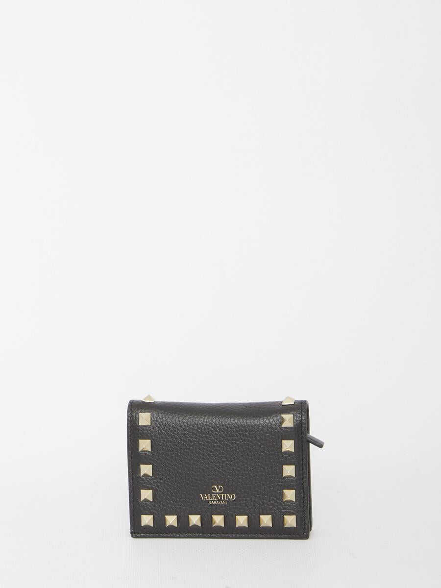 Valentino Garavani Rockstud bi-fold wallet in black grained leather with platinum-finish studs. It features snap-button closure, one zipped coin pocket, one bill compartment, five card slots and one additional slip pocket. Any leather imperfections are not to be considered manufacturing defects, but a peculiarity of the material.
