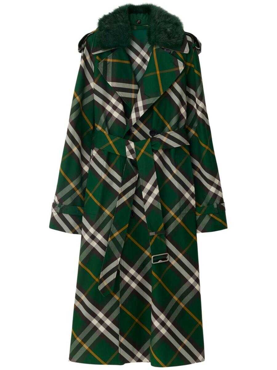 dark green/black/off-white cotton check pattern shearling collar notched lapels double-breasted button fastening belted waist long sleeves straight hem mid-length
