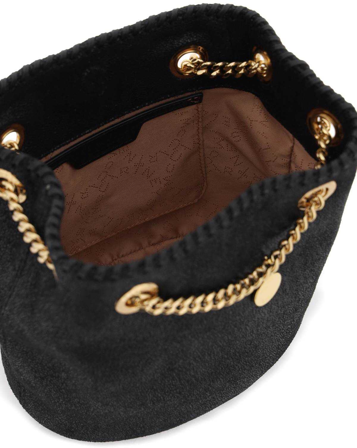 Falabella bucket bag by Stella McCartney made of vegan Shaggy Deer fabric with a glossy finish. Magnetic closure, organic cotton-lined interior with one open pocket, chain shoulder strap with faux leather shoulder rest. Finished with medal featuring engraved logo at front. Gold-tone recycled brass and aluminum hardware.