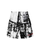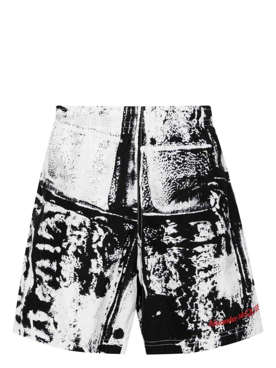 white, black abstract pattern print elasticated waistband two side slit pockets embroidered logo at the leg internal mesh briefs internal drawstring fastening waist Be mindful to try on swimwear over your own garments.