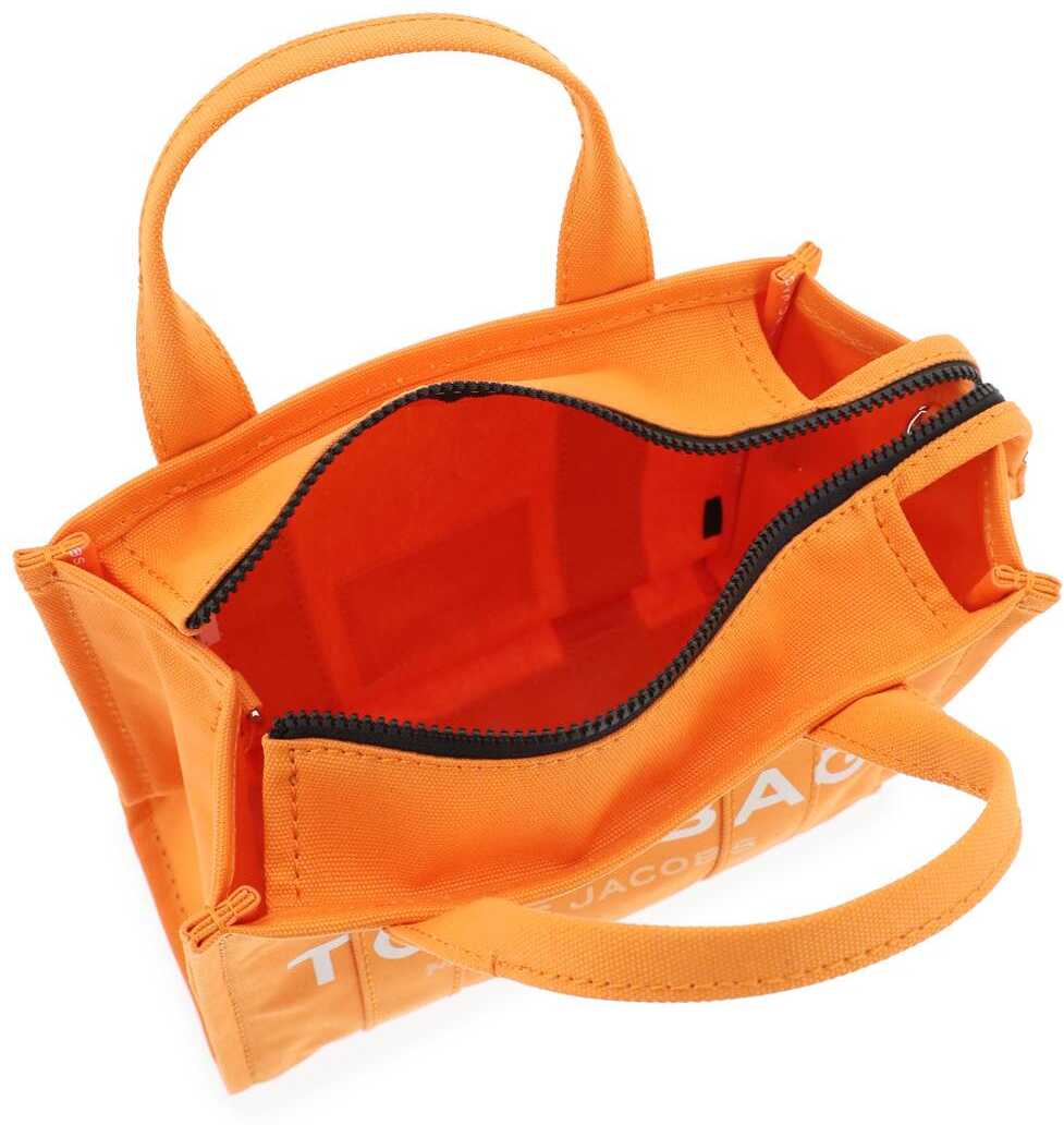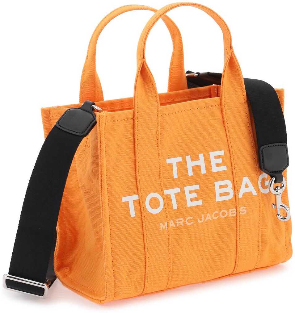The Small Tote bag by Marc Jacobs in cotton canvas, featuring adjustable and removable webbing strap, contrast front logo print, back logo patch, zip closure, side handle. Unlined interior. Steel-finished metalware.