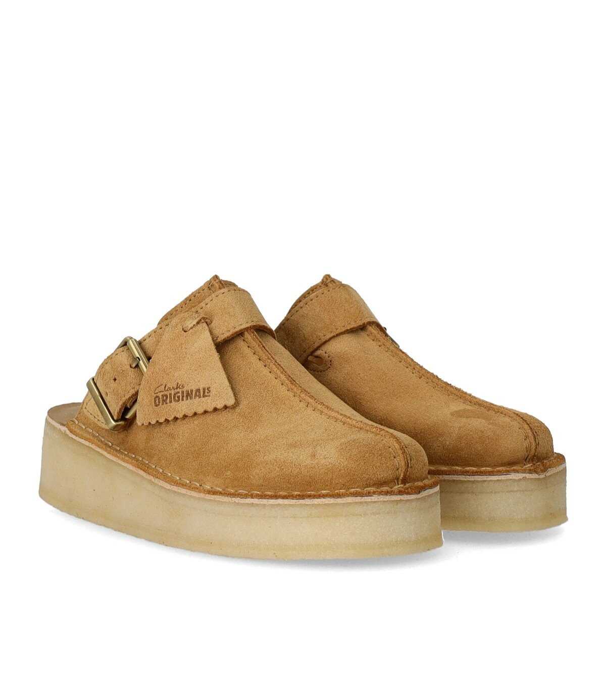 Trek clog by Clarks made of camel suède. Adjustable strap with buckle embellished with logo detail. Leather lining and insole, rubber platform sole, 4 cm height.