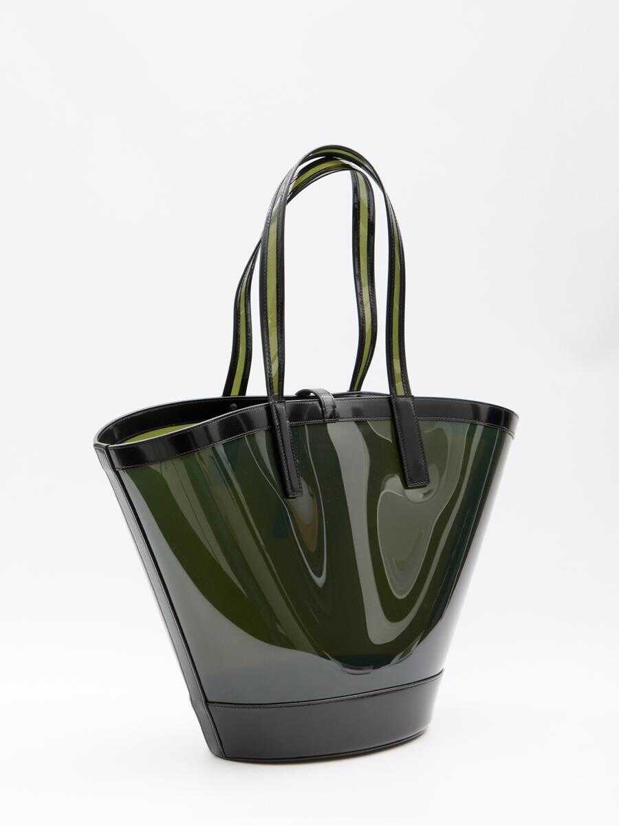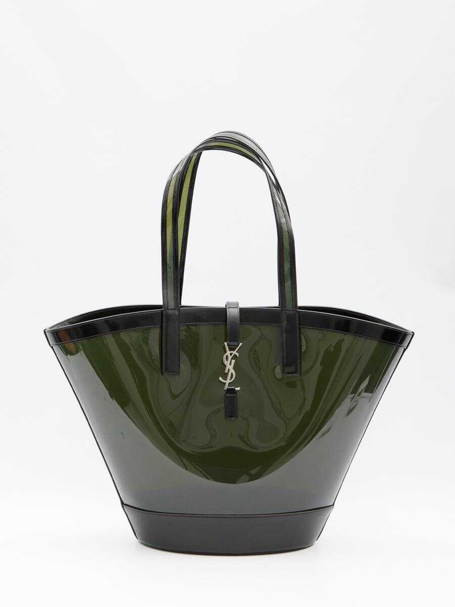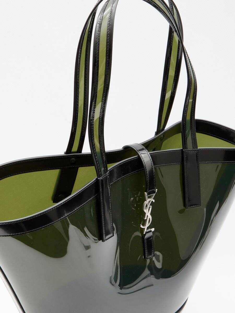 Panier medium bag in transparent vinyl with black leather trims. It features fixed double handles, hook closure with silver-tone metal Cassandre and one main interior compartment.