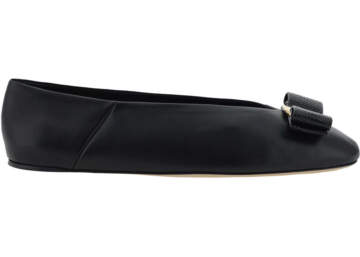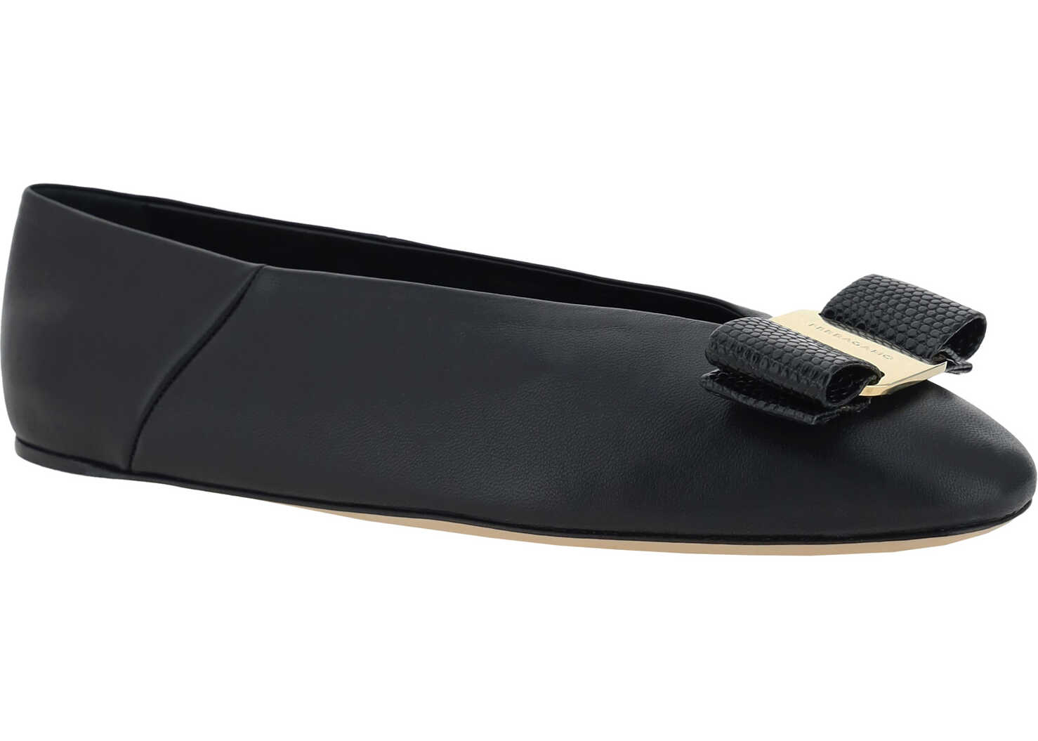 Calfskin Vara Ballerinas by Ferragamo, round toe, flat sole, bow with metal plaque applique on front, contrasting logo insole.