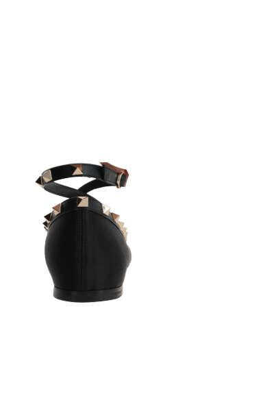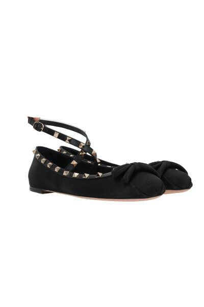 Valentino Garavani's ballerinas crafted in black satin with tone-on-tone nappa trims adorned with signature platinum-tone metal studs. Featuring adjustable ankle-strap, a round-toe silhouette, decorative bow, leather lining and leather sole.