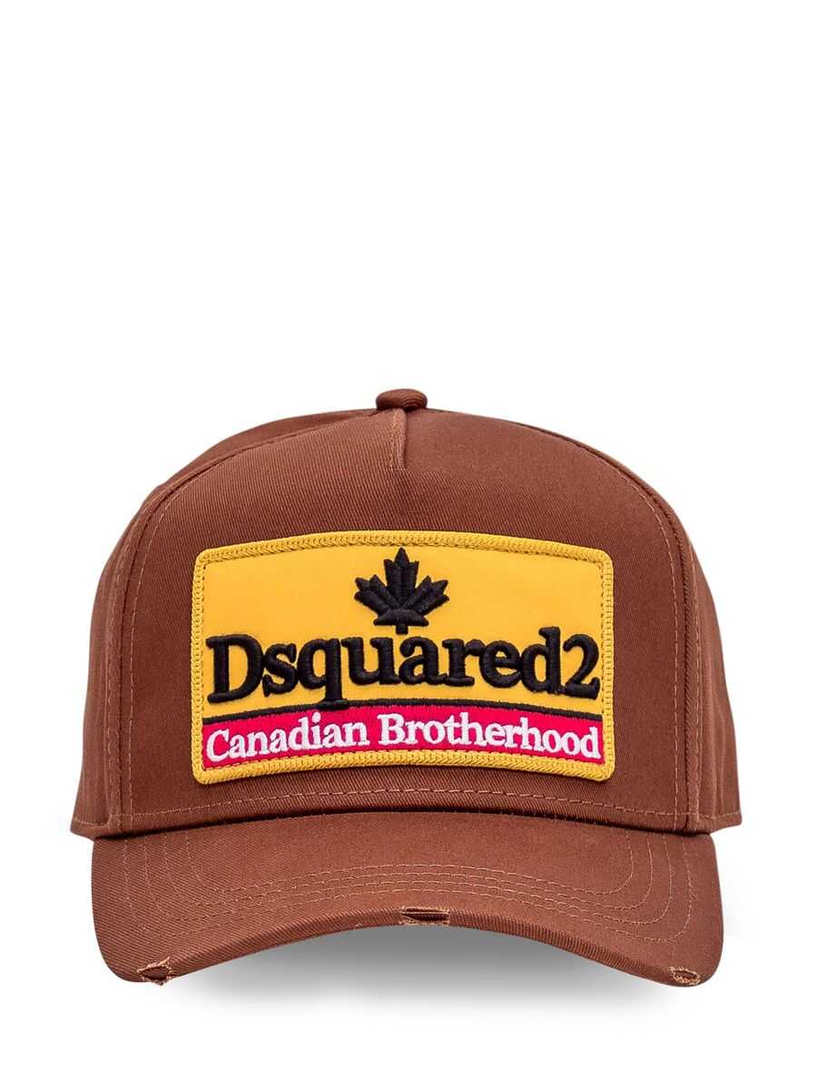 Brown cotton hat from DsQuared2 featuring curved peak, frontal logo, adjustable and slip on style.
