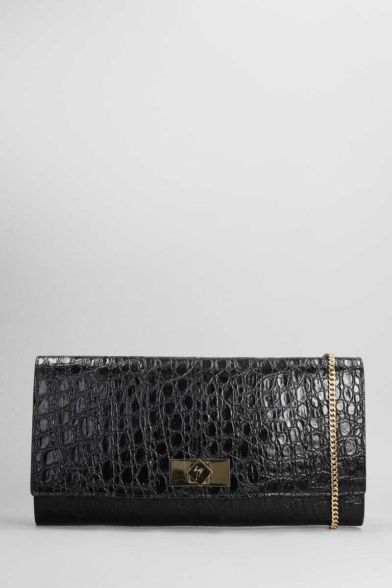 Montserrat crocco Clutch in black leather, chain shoulder strap, internal pocket, gold hardware, crocodile embossed leather, turn lock, Made in Italy, 100% leather, Height 170 mm, Width 330 mm