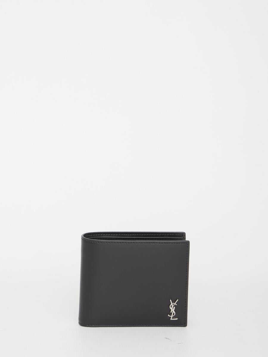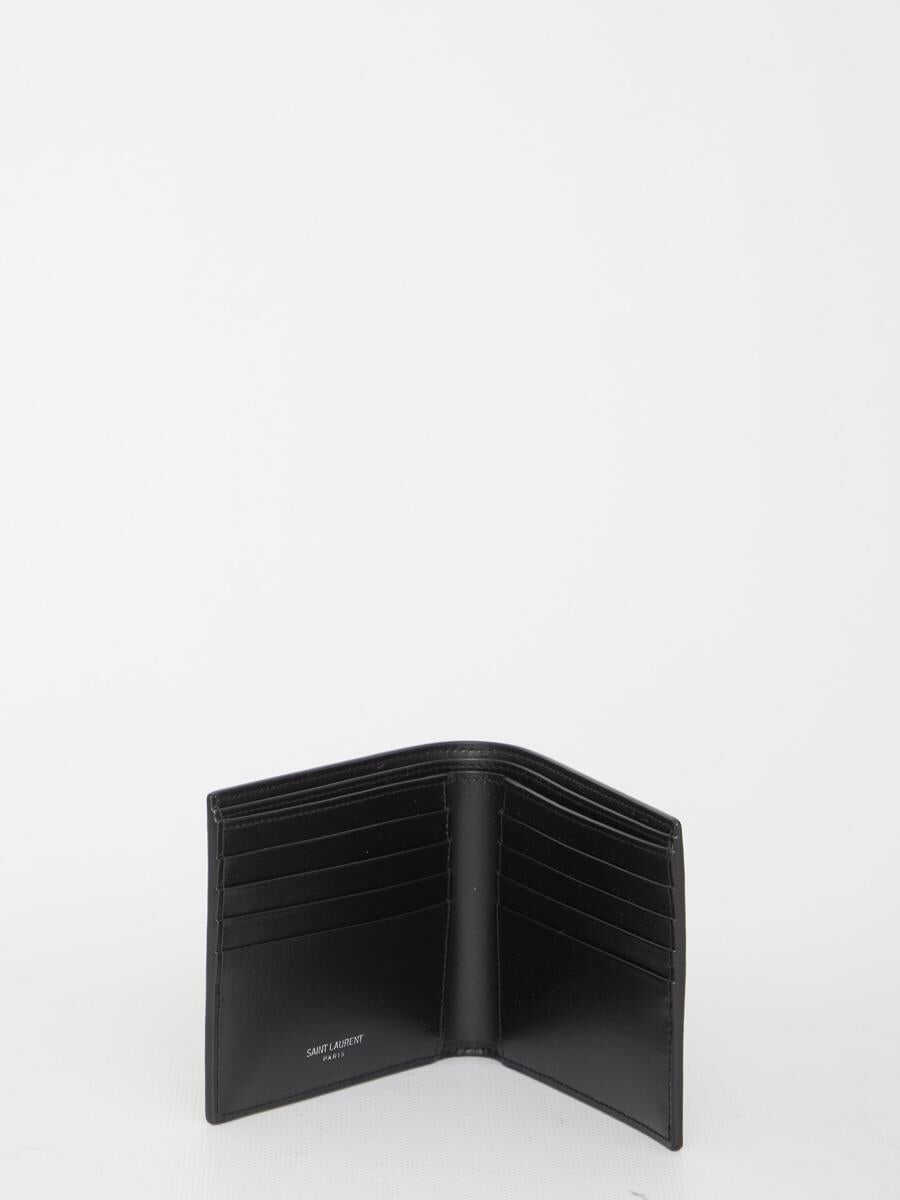 Small Monogram wallet in matte black leather embellished with silver-tone metal YSL initials. It features two bill compartments, two receipt compartments and eight card slots. Any leather imperfections are not to be considered manufacturing defects, but a peculiarity of the material.