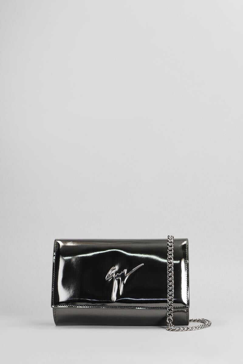Cleopatra Clutch in Gunmetal leather, chain and leather carry, 3d front logo, magnetic closure, internal pocket, silver hardware, 100% leather, Made in Italy, Height 120 mm, Width 185 mm