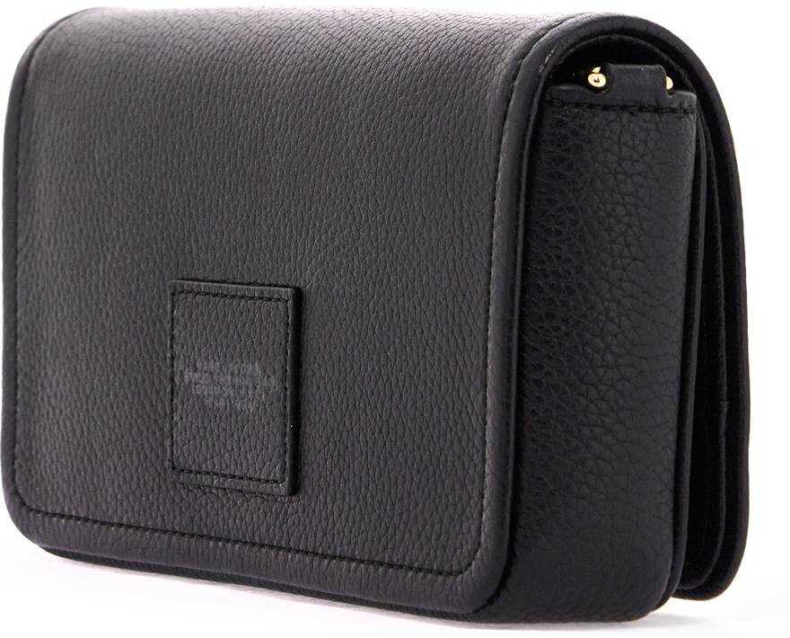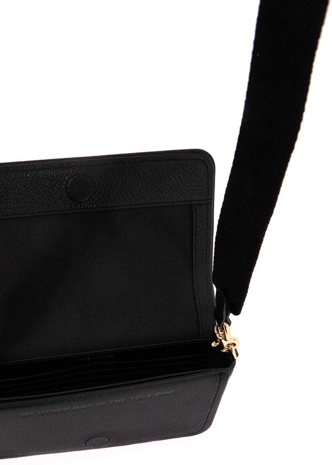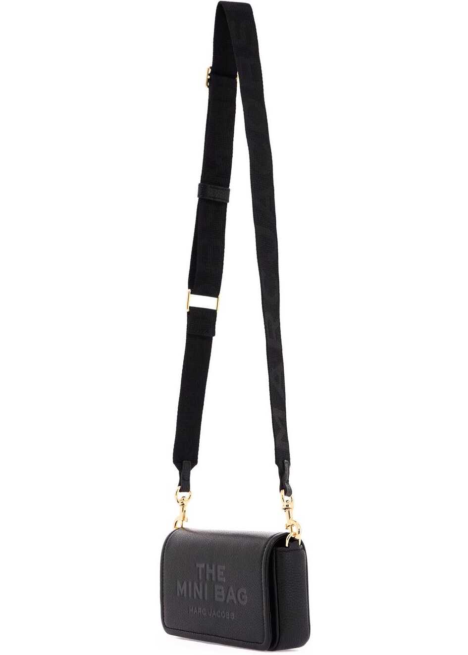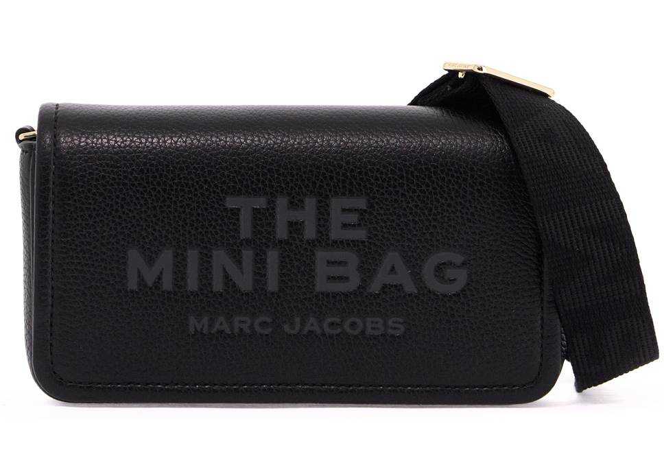 This Marc Jacobs mini bag is made of hammered leather and finished with embossed lettering on the magnetic flap, featuring the phrase 'MY OTHER BAG IS THE TOTE BAG' on the flat inner pocket. It has a main compartment and eight credit card slots. The additional and adjustable shoulder strap features jacquard logo lettering. The metal accessories have a gold finish.