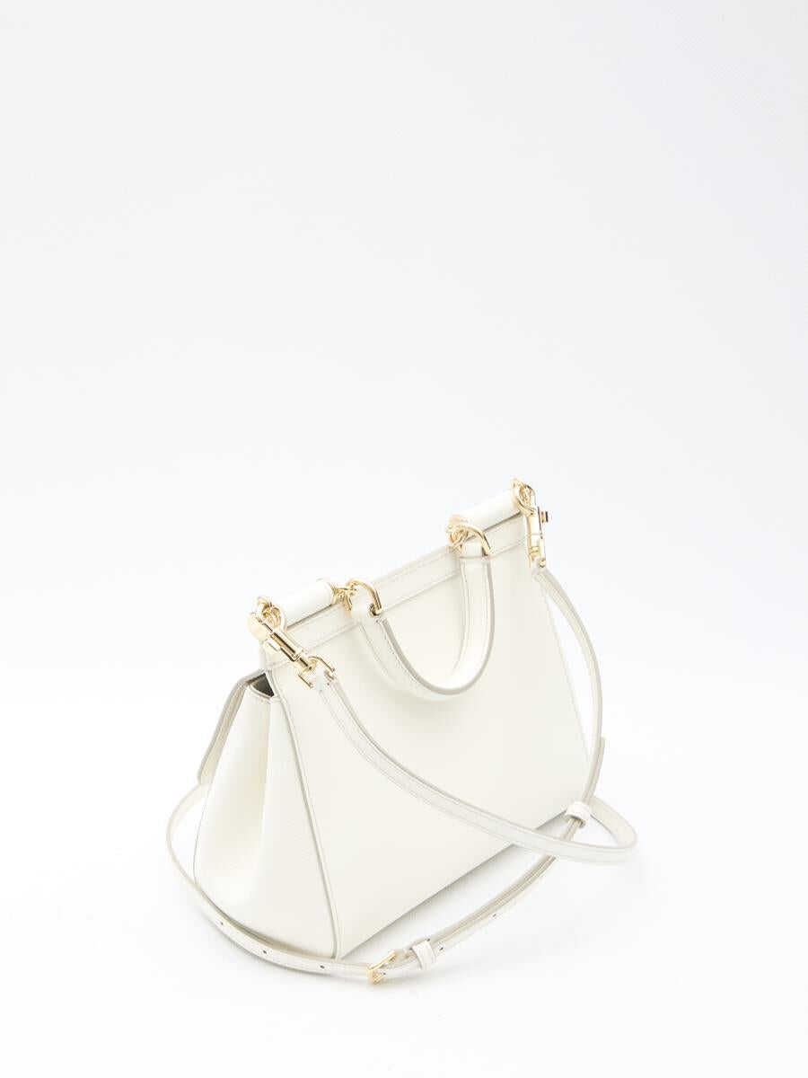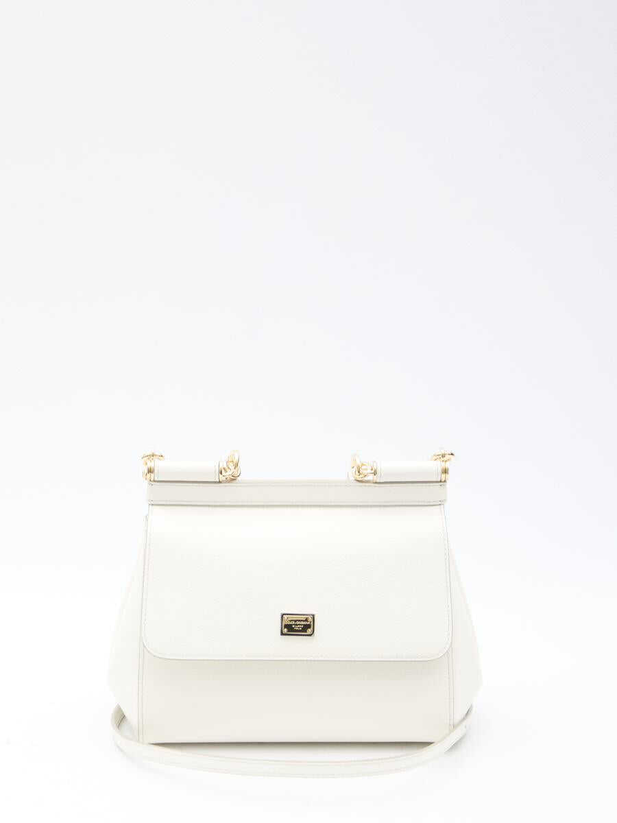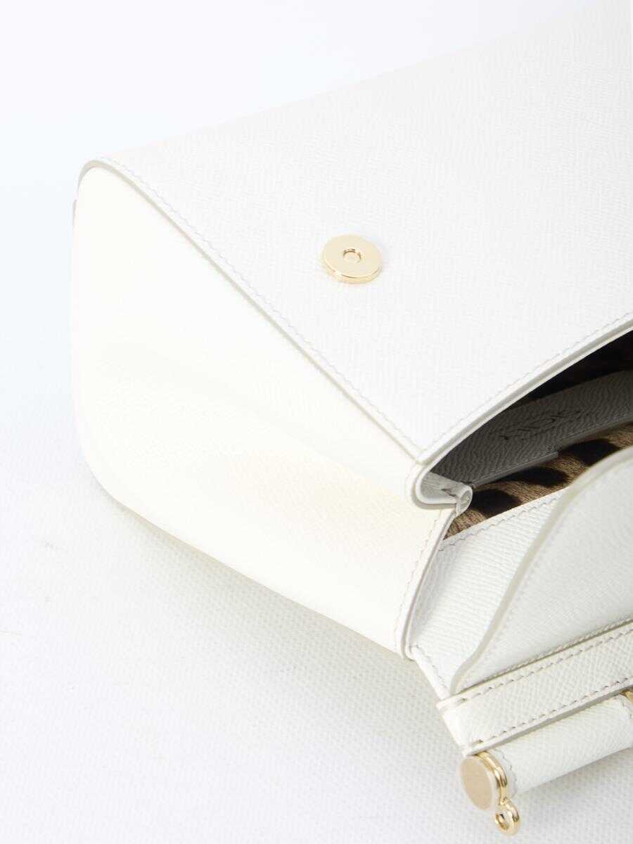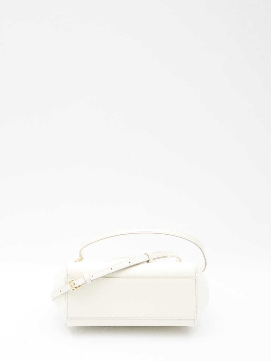 Medium Sicily handbag in white Dauphine calfskin with branded plate on the front. It features fixed top handle, adjustable and detachable shoulder strap, magnetic flap closure, one main interior compartment, one interior flat pocket and one interior card slot. Leo-print fabric lining. Any leather imperfections are not to be considered manufacturing defects, but a peculiarity of the material.