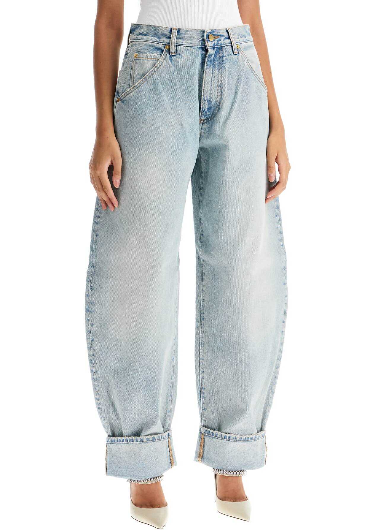 DarkPark five-pocket jeans characterized by a barrel silhouette with rolled cuffs at the bottom. Made of light wash denim, they feature distressed finishes, belt loops and a zip and button closure. The model is 177 cm tall and wears size 26.