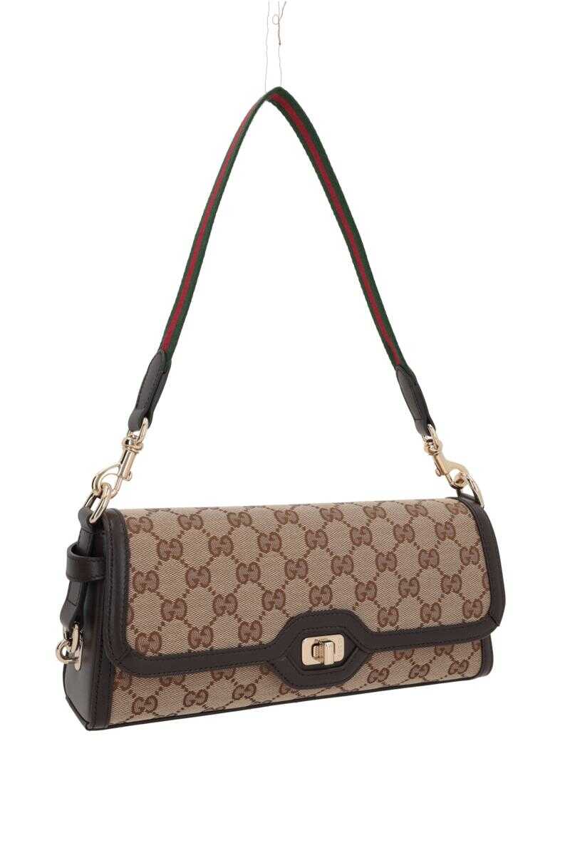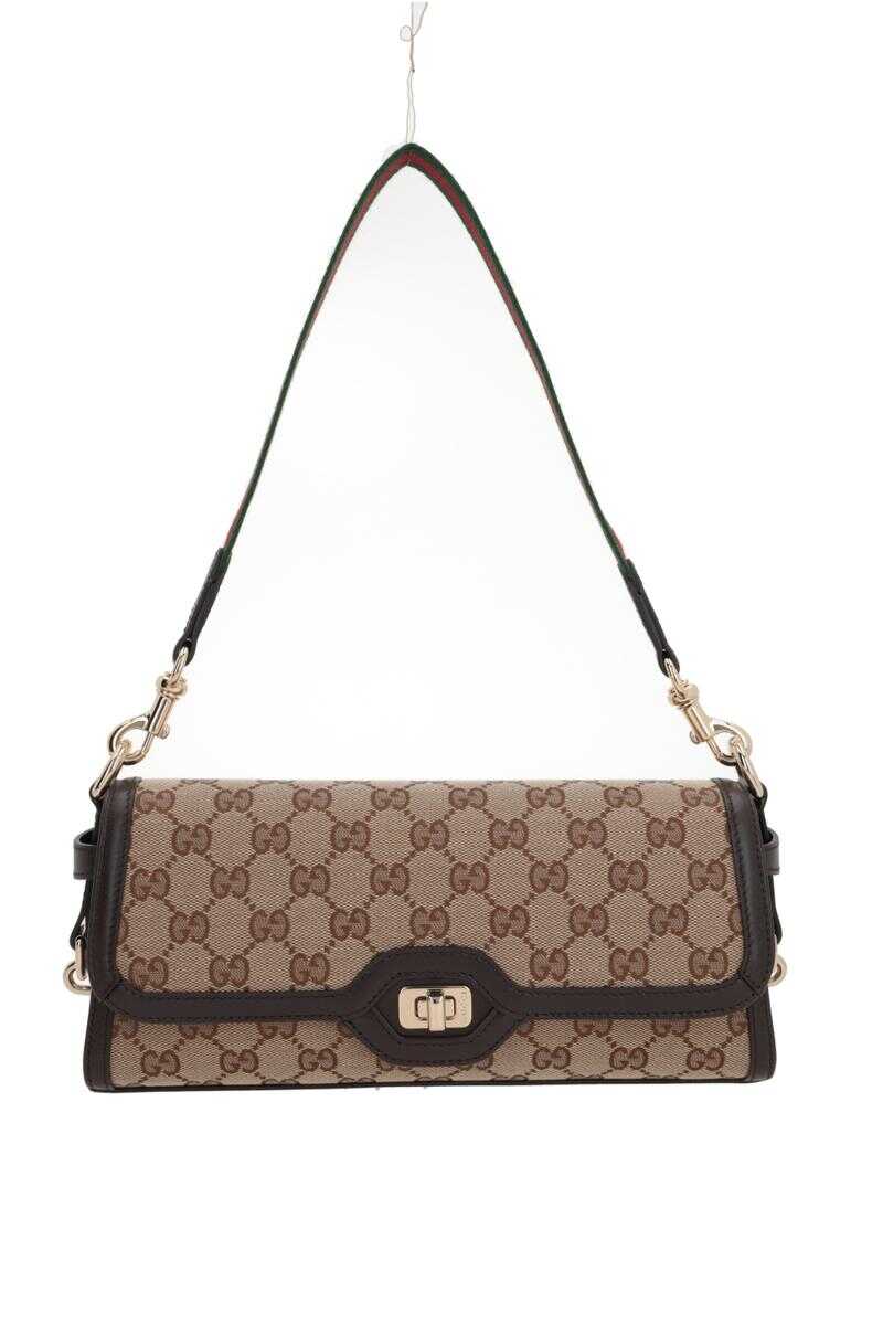 Gucci's handbag crafted in beige and brown Original GG canvas with dark brown smooth leather trims. It features light gold-tone hardware, turn-lock closure on flap and removable Web fabric handle. Brown canvas-lined interior with zip pocket.
