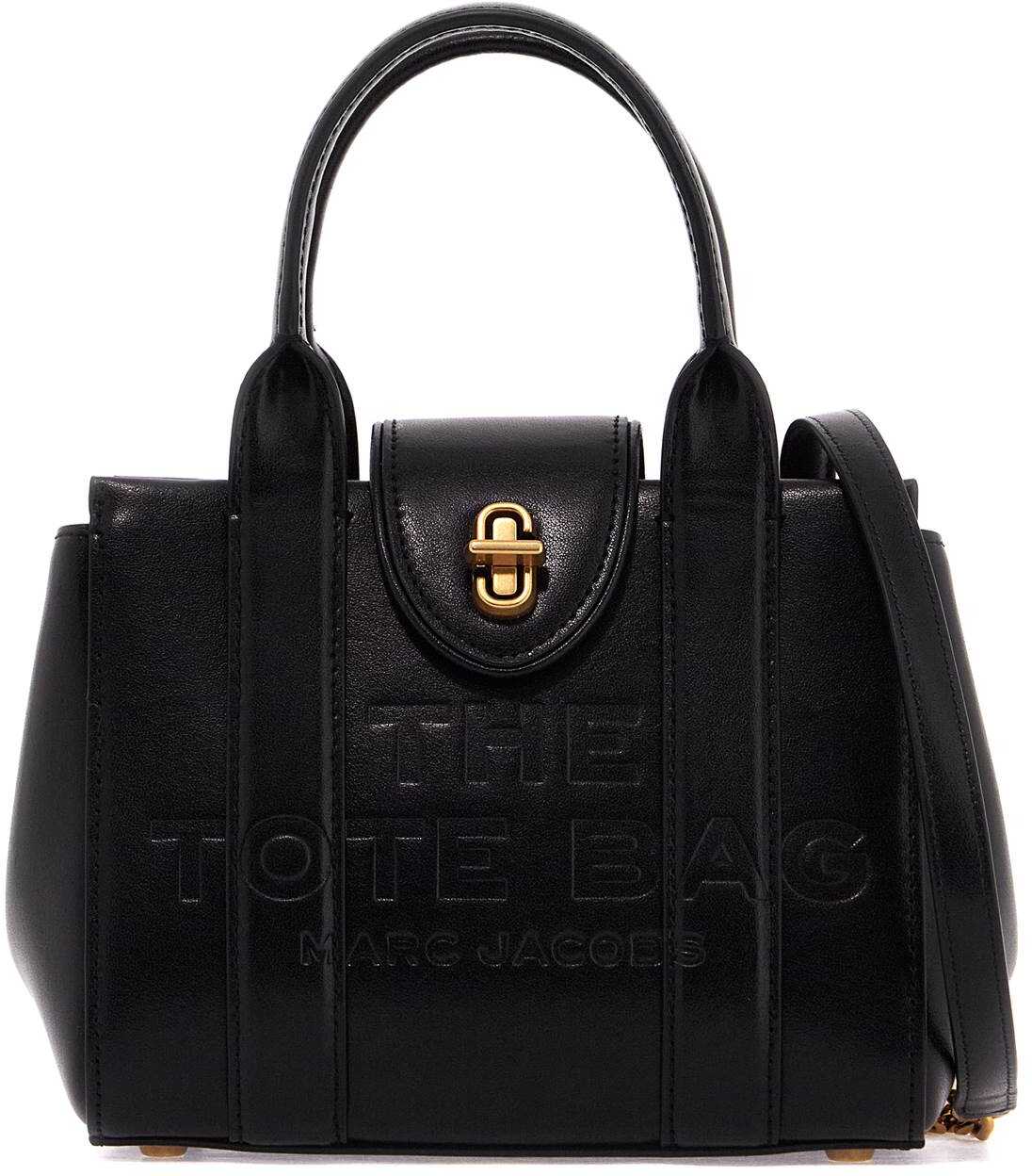 The Turnlock Crossbody Bag by Marc Jacobs is made of soft leather and features a structured design with a J Marc lock closure and an embossed logo on the front. It has double handles, a lined interior in nappa leather with a zip pocket, an additional chain shoulder strap with a leather shoulder rest, and protective feet at the base. The metal accessories have a gold finish.