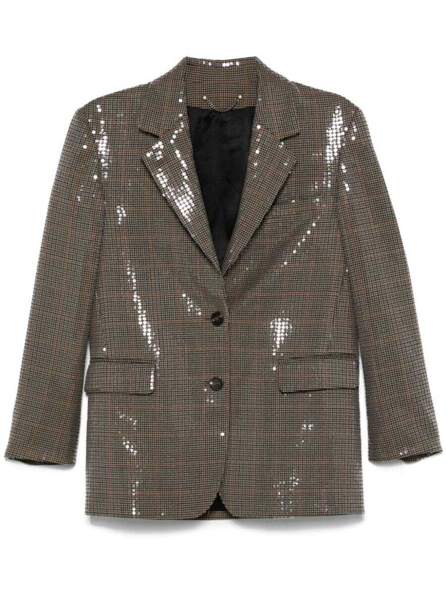 beige/black wood houndstooth pattern sequin embellishment front button fastening peak lapels long sleeves buttoned cuffs chest welt pocket dart detailing two front flap pockets full lining straight hem