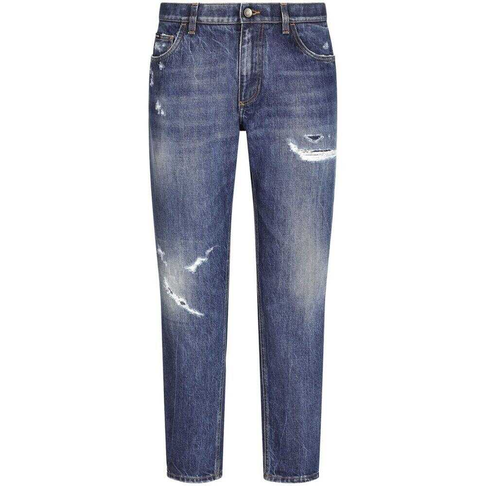 Blue cotton ripped detailing washed denim classic five pockets front button and zip fastening belt loops embroidered logo to the rear