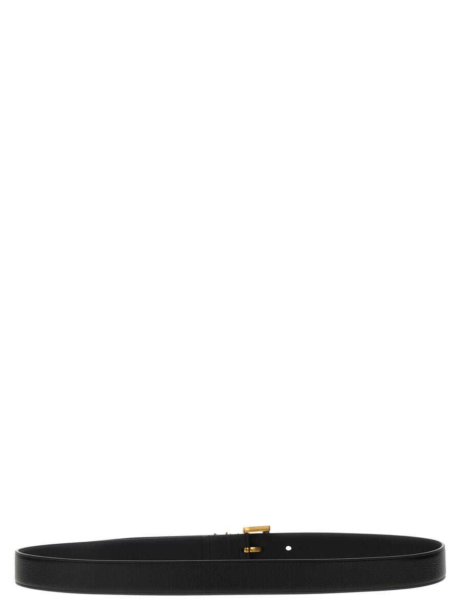 Black leather belt from Saint Laurent featuring gold tone hardware, frontal logo and buckle fastening.