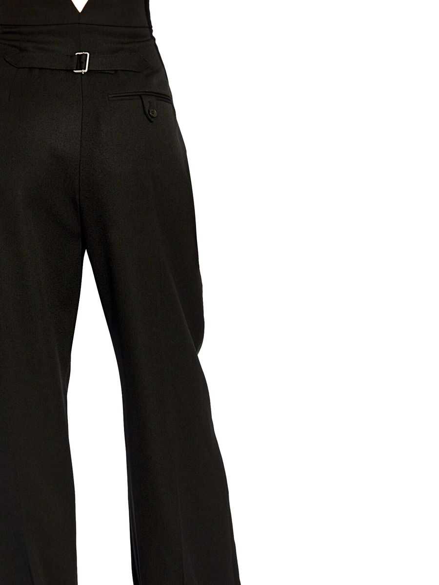 black wool twill weave high-rise pressed crease slip pockets to the sides rear button-fastening jetted pocket wide leg extra-long length concealed side zip fastening rear buckle fastening