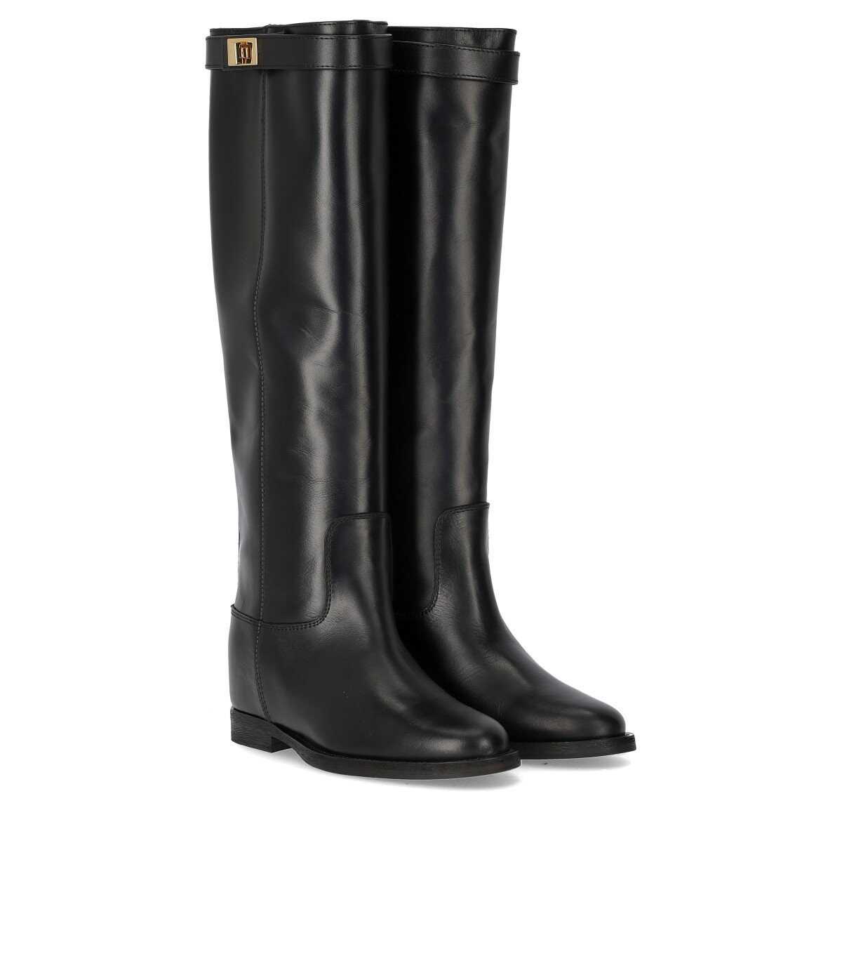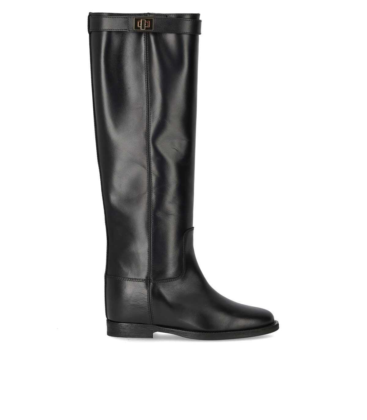 Boot Via Roma 15 made of black leather. Strap with golden lock, leather interior equipped with a 5 cm wedge. Leather sole, heel height 2 cm. Height of the shaft (from the heel) 43.5 cm.