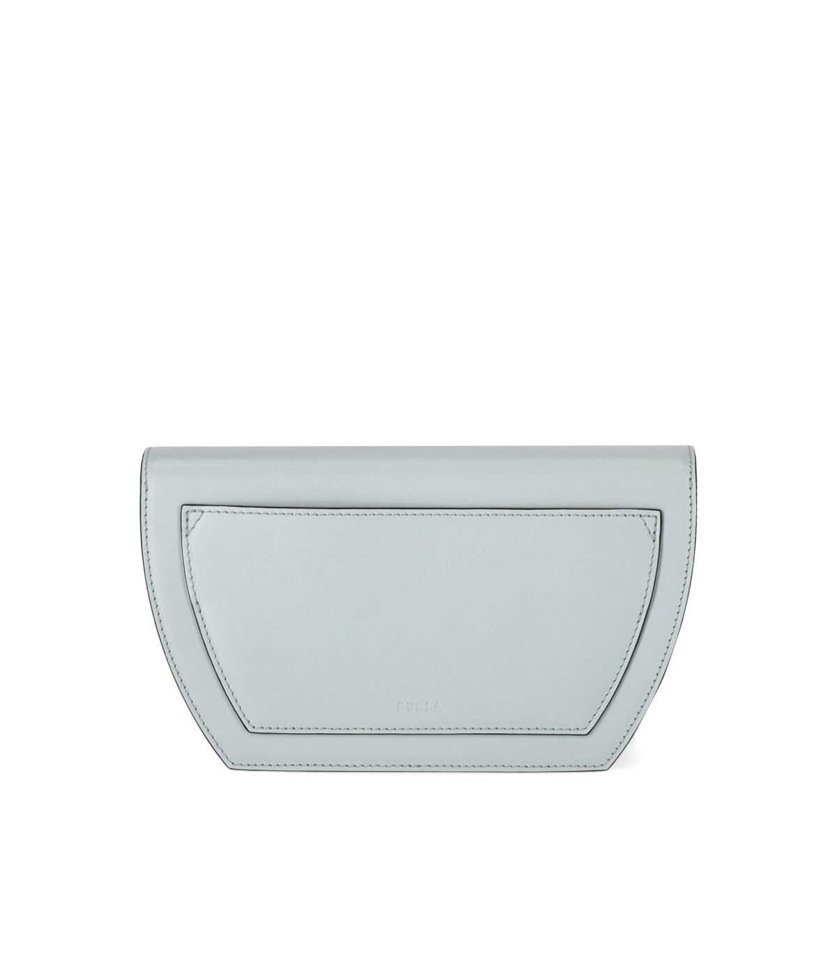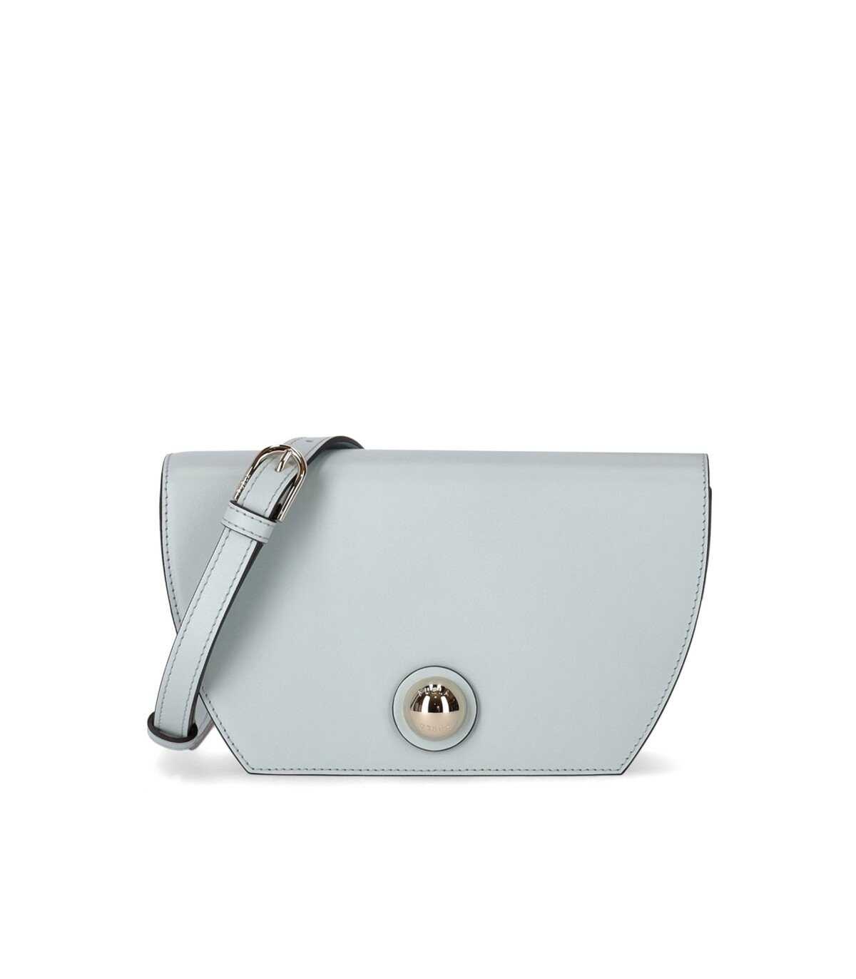 Furla Sfera shoulder bag made of light blue leather. Gold metal details, logo closure on the front, and adjustable strap that allows the bag to be worn both as a crossbody and as a lined internal fanny pack. Lined interior, equipped with a wall pocket with zip. Measurements 15x13x6 cm.