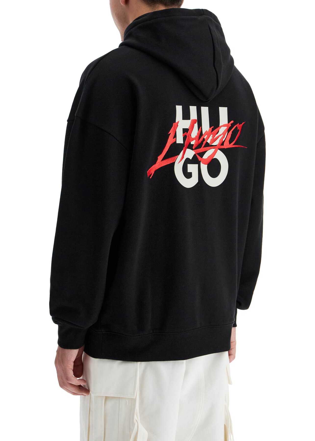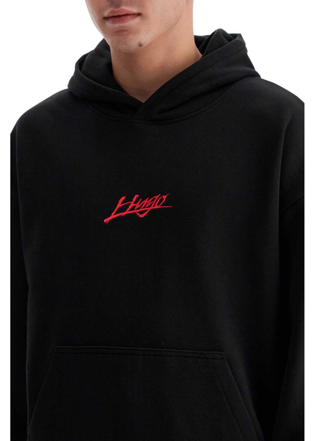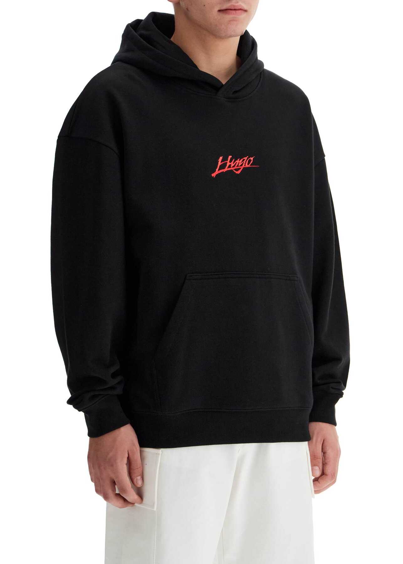 The Hugo hoodie is made of medium-weight brushed cotton jersey and features a large printed and embroidered logo graphic on the back, as well as an embroidered detail on the front. It has a kangaroo pocket and ribbed cuffs and hem. The fit is oversized. The model is 182 cm tall and wears a size M.