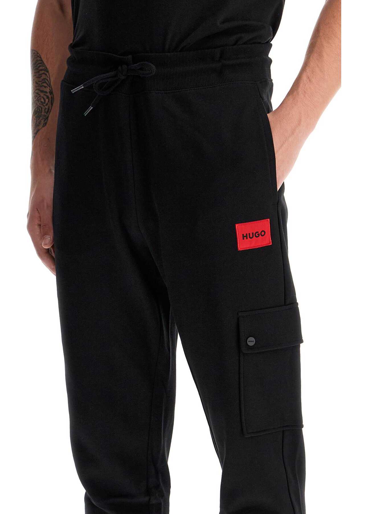 Hugo sporty pants in brushed cotton jersey with sewn logo label on the side and cargo-style pocket on the leg. They feature a stretch ribbed waistband with drawstring, pockets inserted on the sides, a welt pocket on the back, and ribbed cuffs at the ankles. Relaxed fit. The model is 182 cm tall and wears size M.