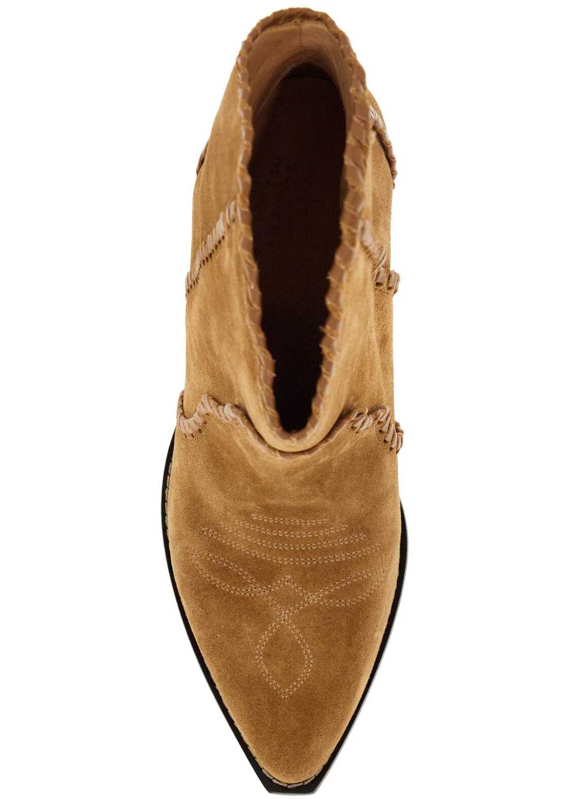 The Darizo ankle boots by Isabel Marant are made of suede leather and feature a classic Texan design, embellished with embroidered leather trims and the iconic front embroidery. The interior is lined with soft leather, while the heel is shaped like a funnel and the sole is made of leather.