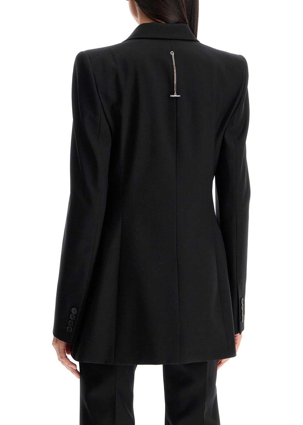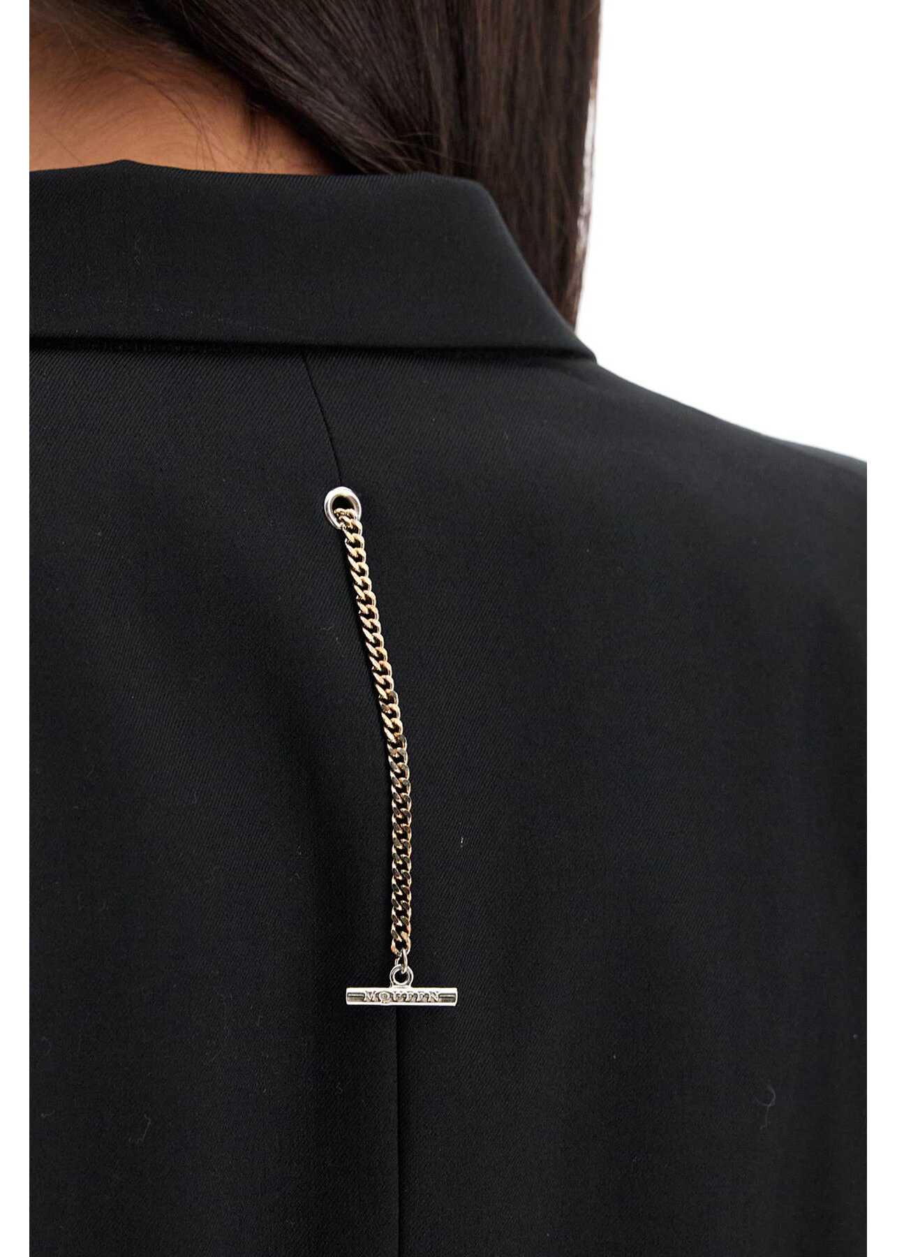 This Alexander McQueen single-breasted jacket is made of wool gabardine with structured straight shoulders and a slim peak lapel, adorned with a chain detail on the back. The silhouette is semi-fitted with a side length and a central back vent. Finished with a one-button closure, it features flap pockets, a chest pocket, and a lined interior. The model is 177 cm tall and wears an IT size 40.