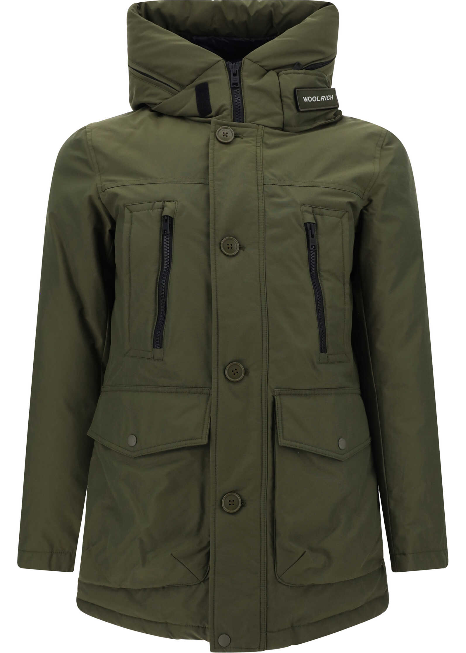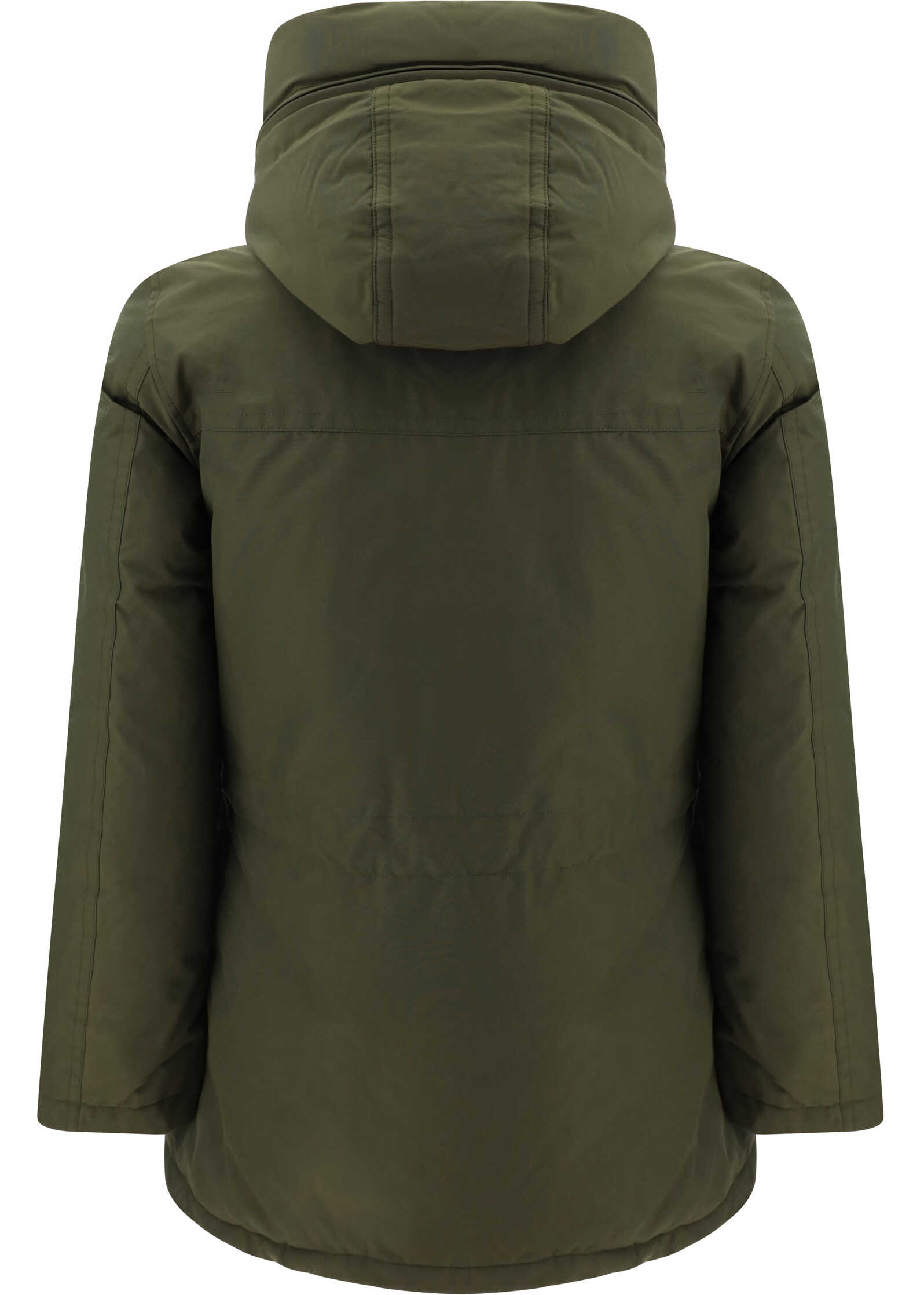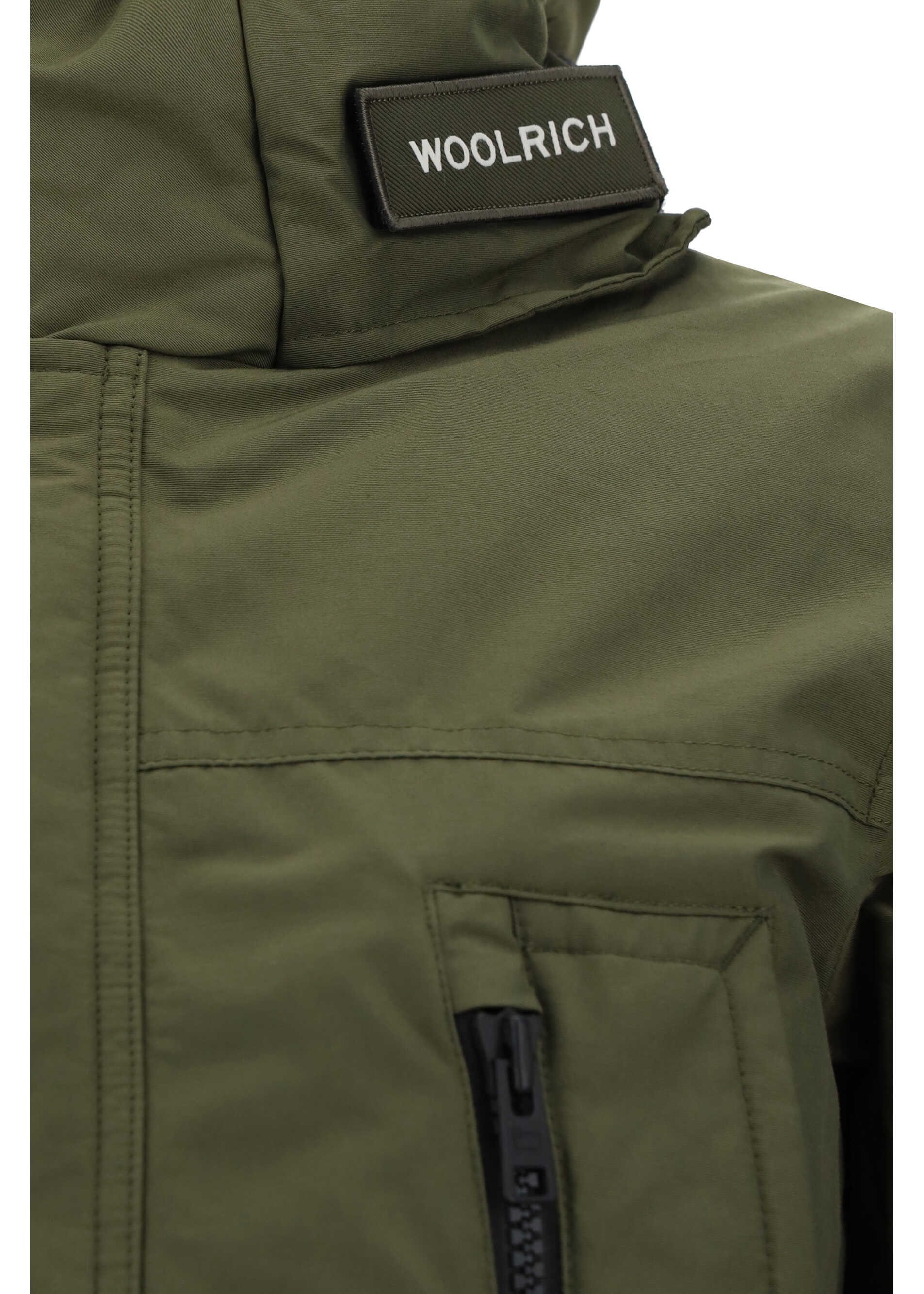 Cotton Ramar Down Jacket by Woolrich, high-necked model with hood, front zipper and button closure, elastic ribbed cuffs, two slit pockets with zipper applied on the front, monochrome padded design, removable patch with iconic brand monogram applied on the hood, two large flap pockets applied on the front, regular fit.