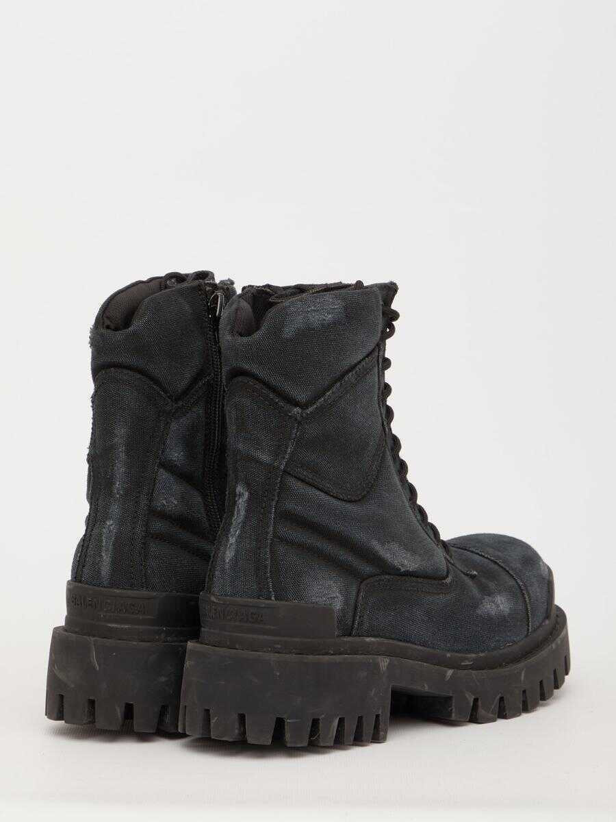 Combat Strike L20 boots in vintage-effect black cotton canvas. They feature front lacing, side zip closure, embossed Balenciaga logo at the back and rubber lug sole.