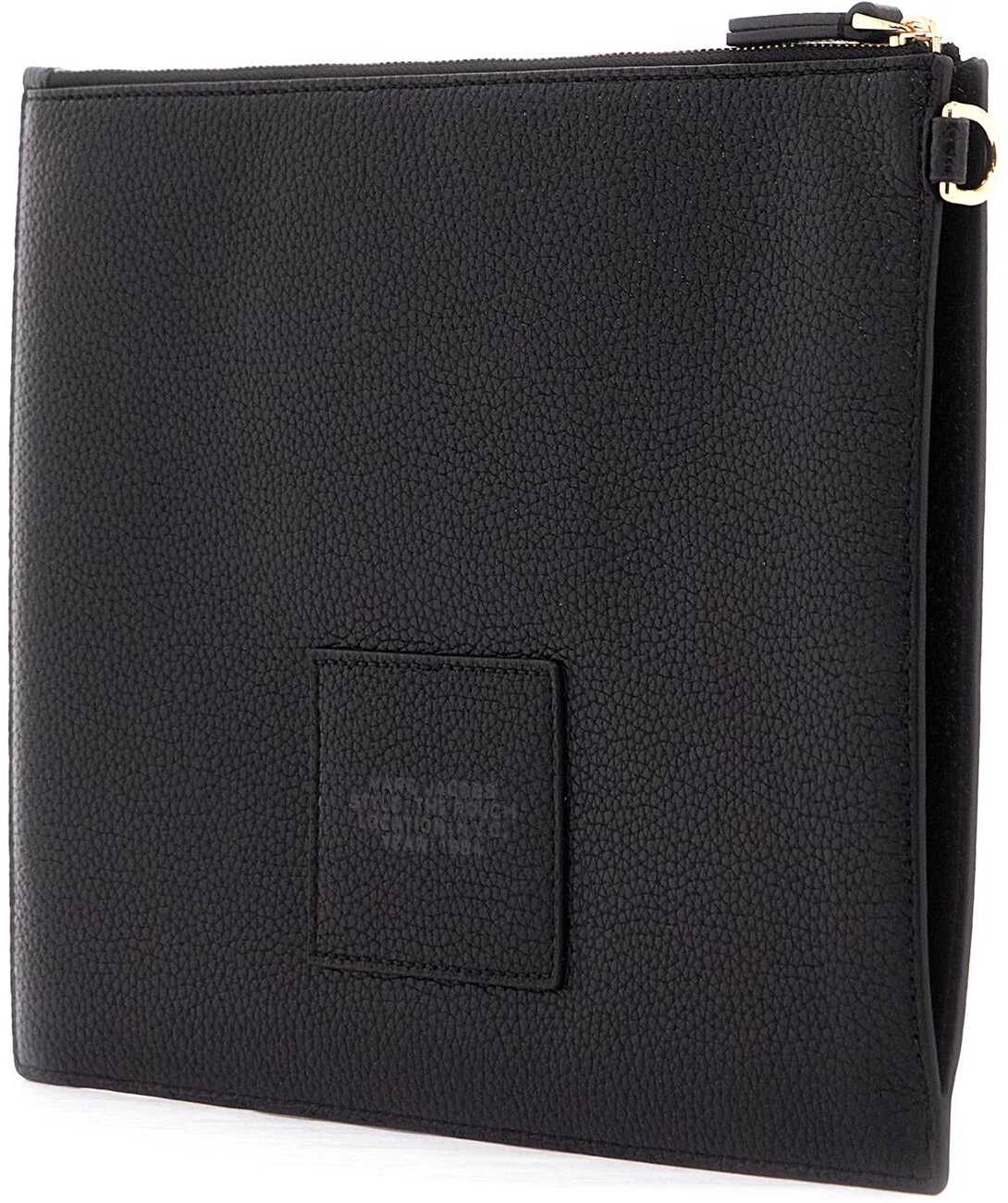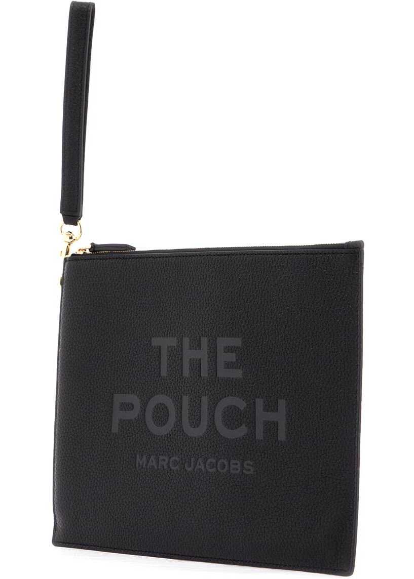 This Marc Jacobs pouch is made of hammered leather with an embossed logo lettering. It features a zip closure, a lined interior with three credit card slots, and a removable wrist strap. The metallic accessories have a palladium finish.